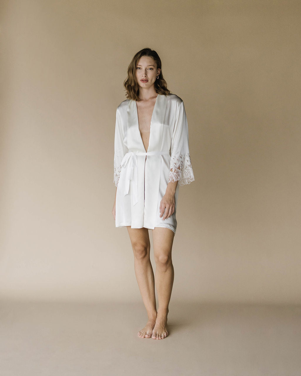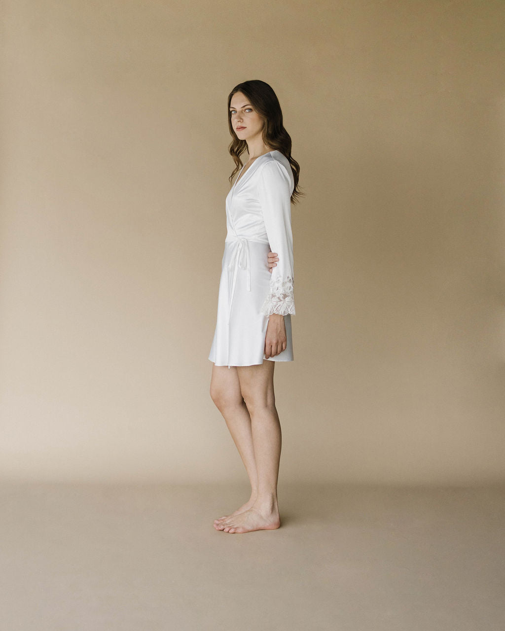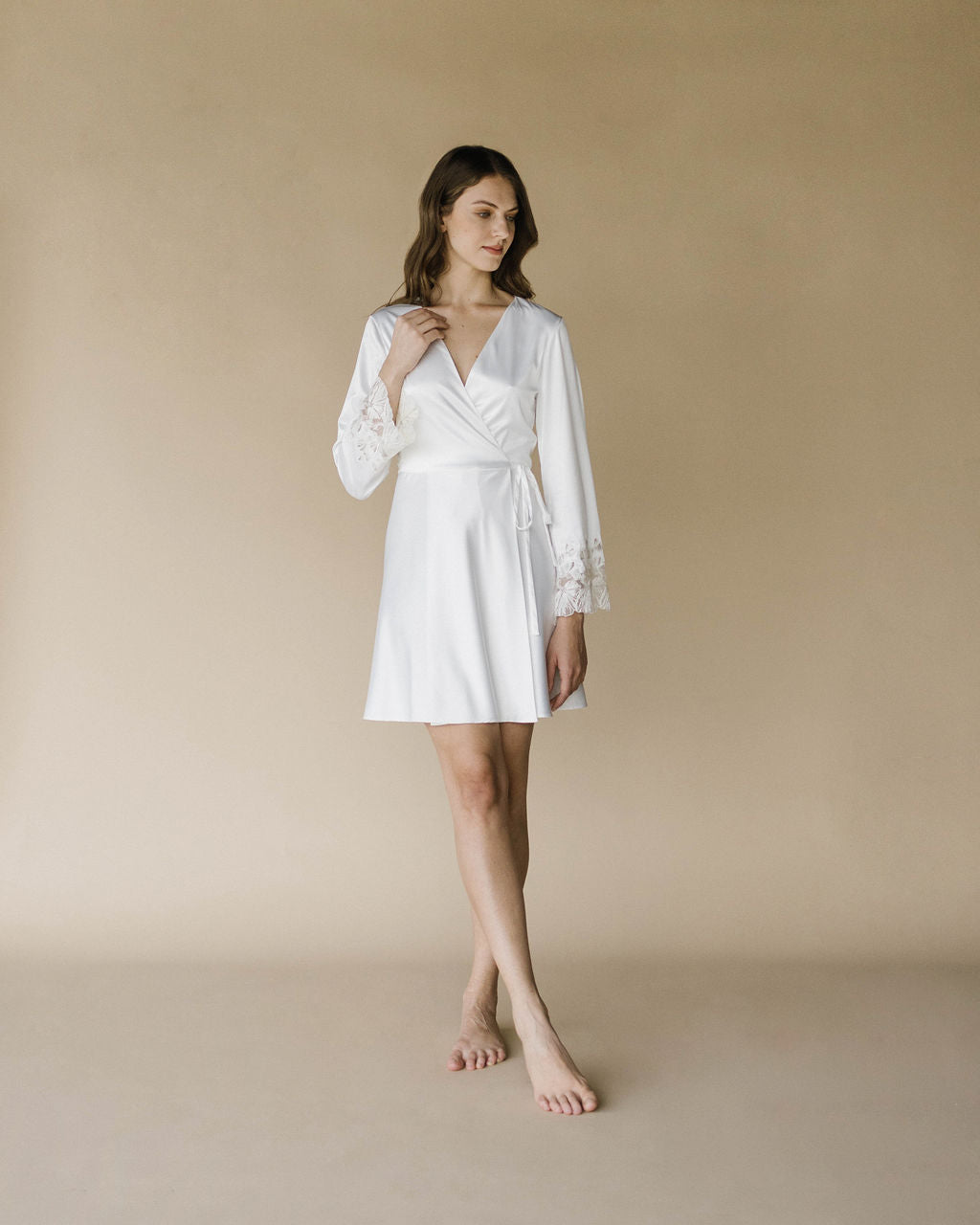 Discover the "Agathe" short robe crafted from stretch satin with exquisite embroidered lace details on the sleeves. This elegant robe features a fitted waist, highlighting your figure. Pair it with our "Colette" nightgown to create the perfect look. Ideal for brides preparing for their wedding day.