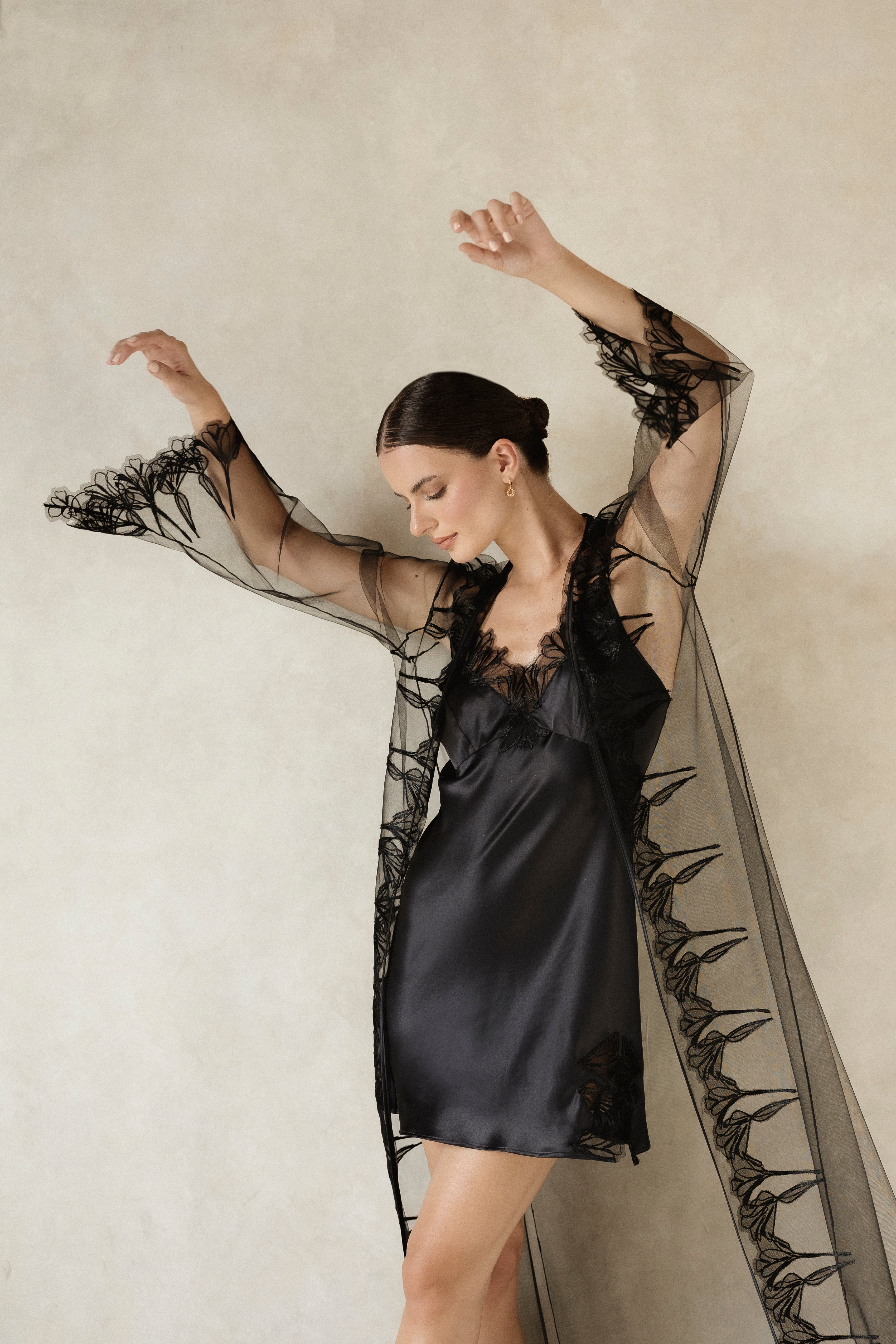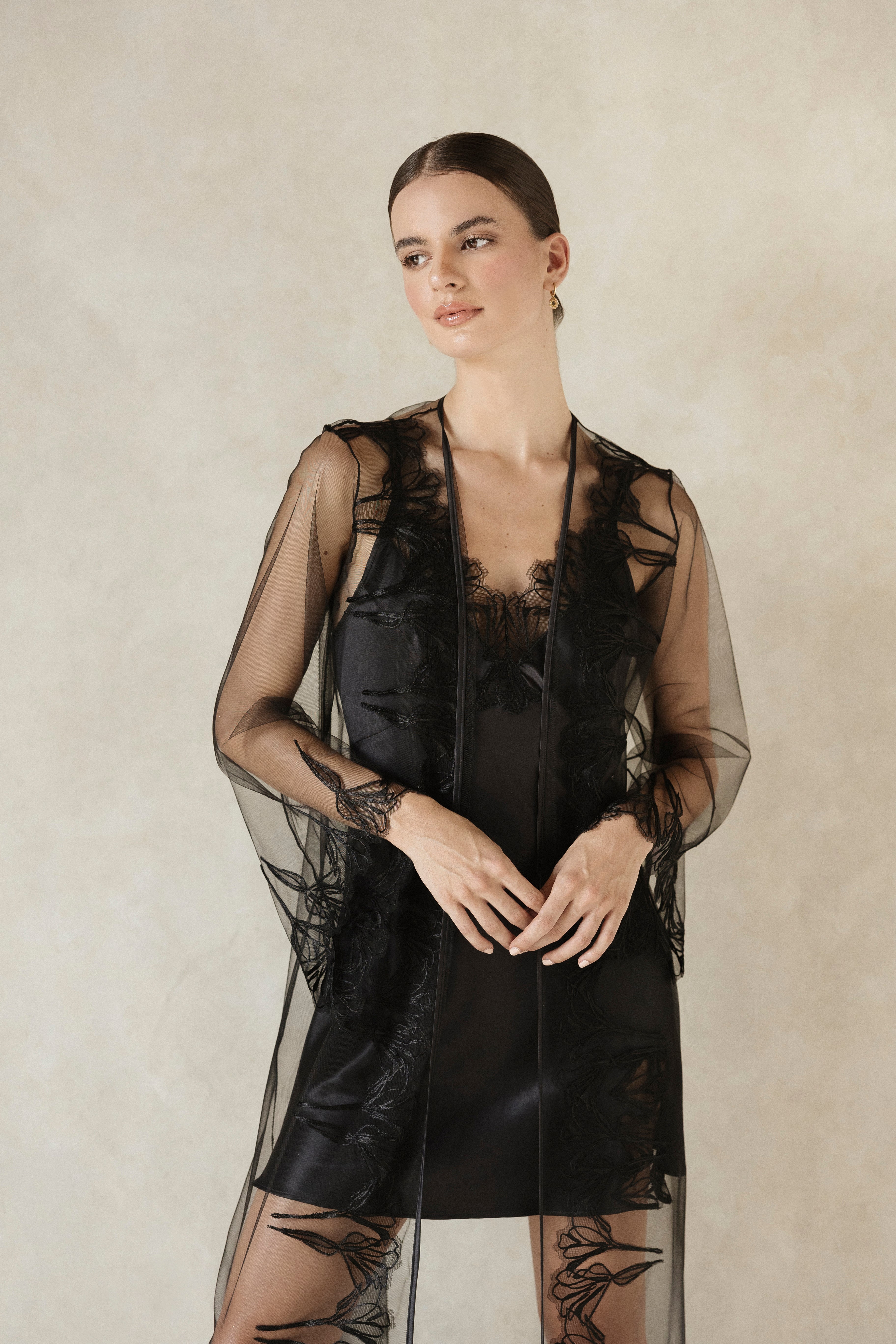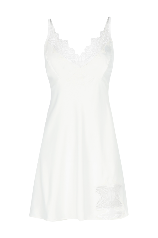 Discover the "Bassin" short nightgown, inspired by Monet's 'Water Lilies'. This nightgown features embroidered lace details at the front neckline and leg slit. Made from stretch satin, it has a double adjustable strap detail that highlights femininity and elegance. Pair it with the "Alice" robe to create the perfect look.