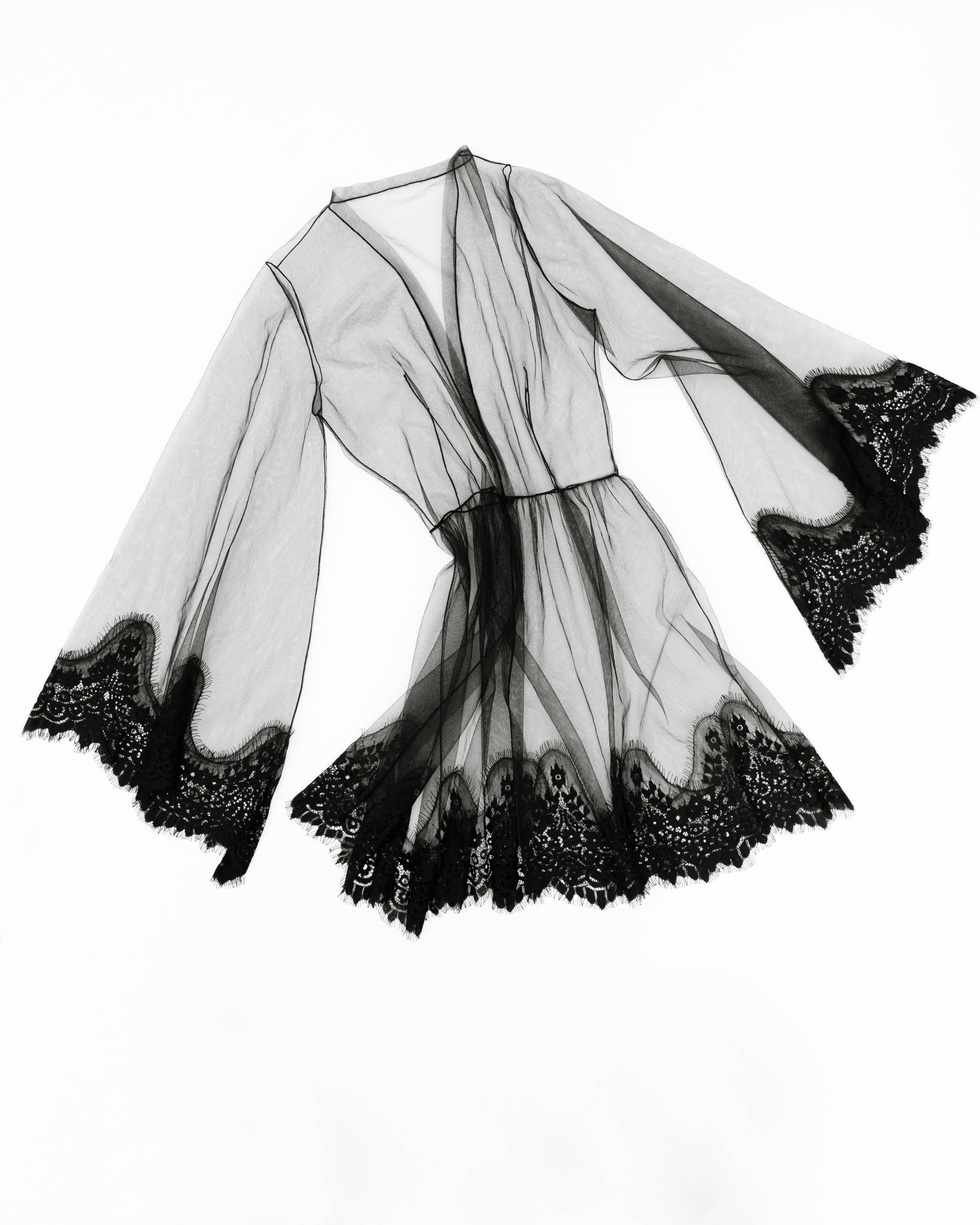 The "Obi" robe is a long mesh robe with lace appliqués, crafted from tulle with lace details at the hem and the ends of the long sleeves. Perfect for lounging comfortably at home and adding an elegant touch to your pajama set.
