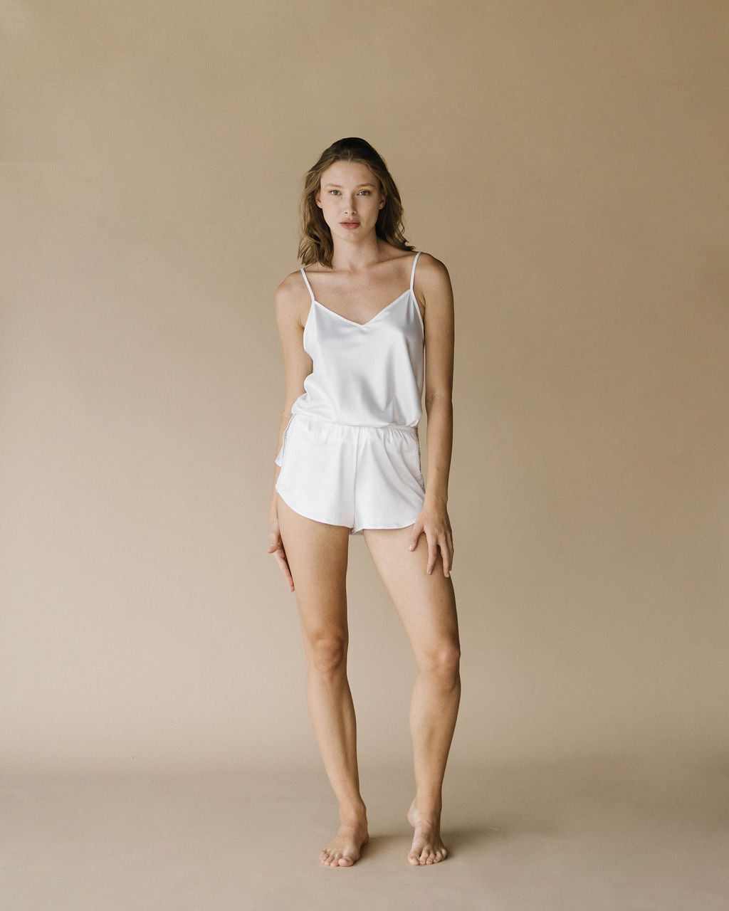 The "Top Soie" is a stretch satin garment that combines softness, comfort, and elegance in a single piece. Its lightweight and flattering design makes it ideal for wearing at home as pajamas or under comfortable clothes, without sacrificing style. At the same time, its sophisticated finish allows you to easily incorporate it into casual or formal outfits, effortlessly elevating any look. To create your complete pajama set, pair it with the "Soie" shorts.