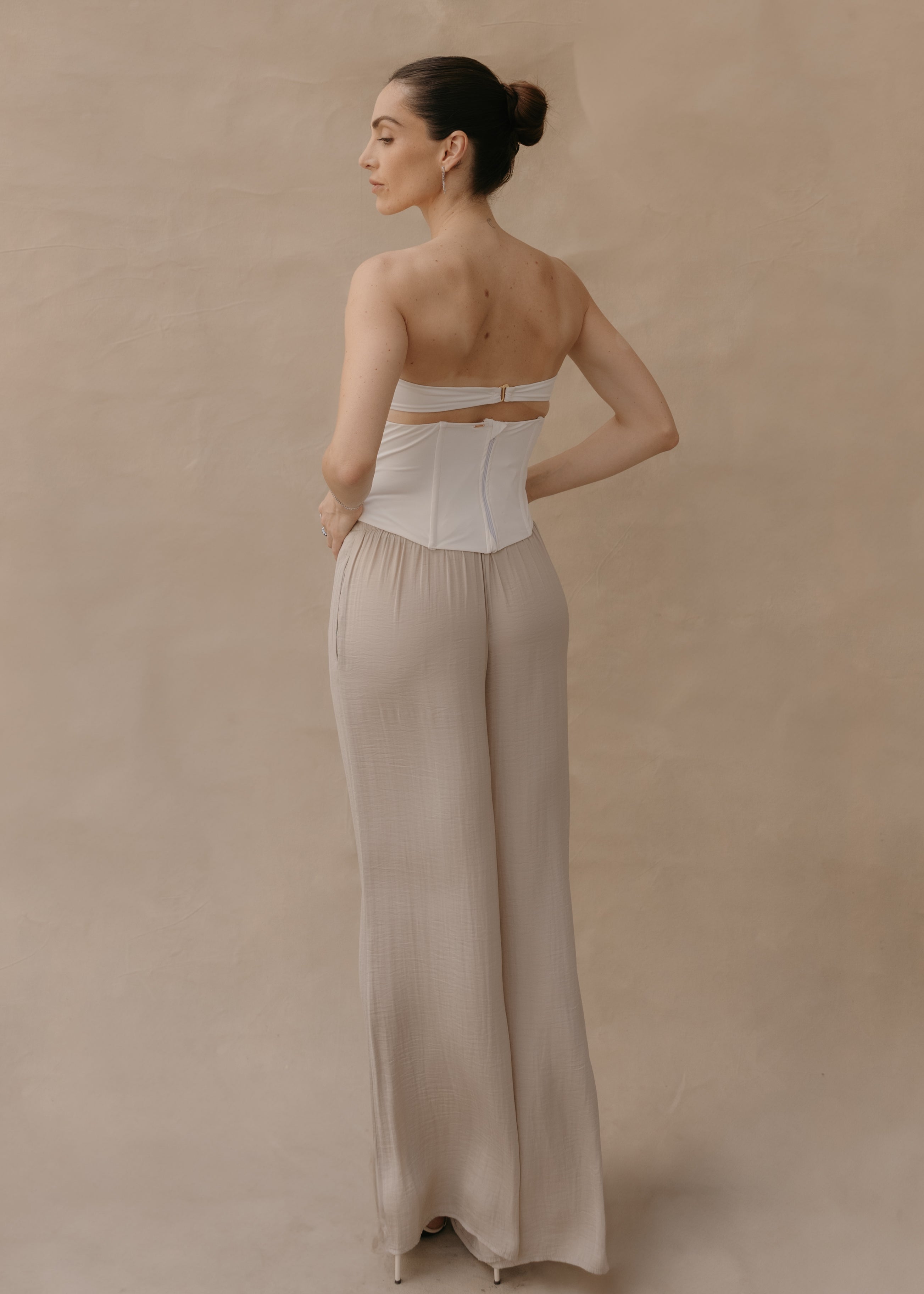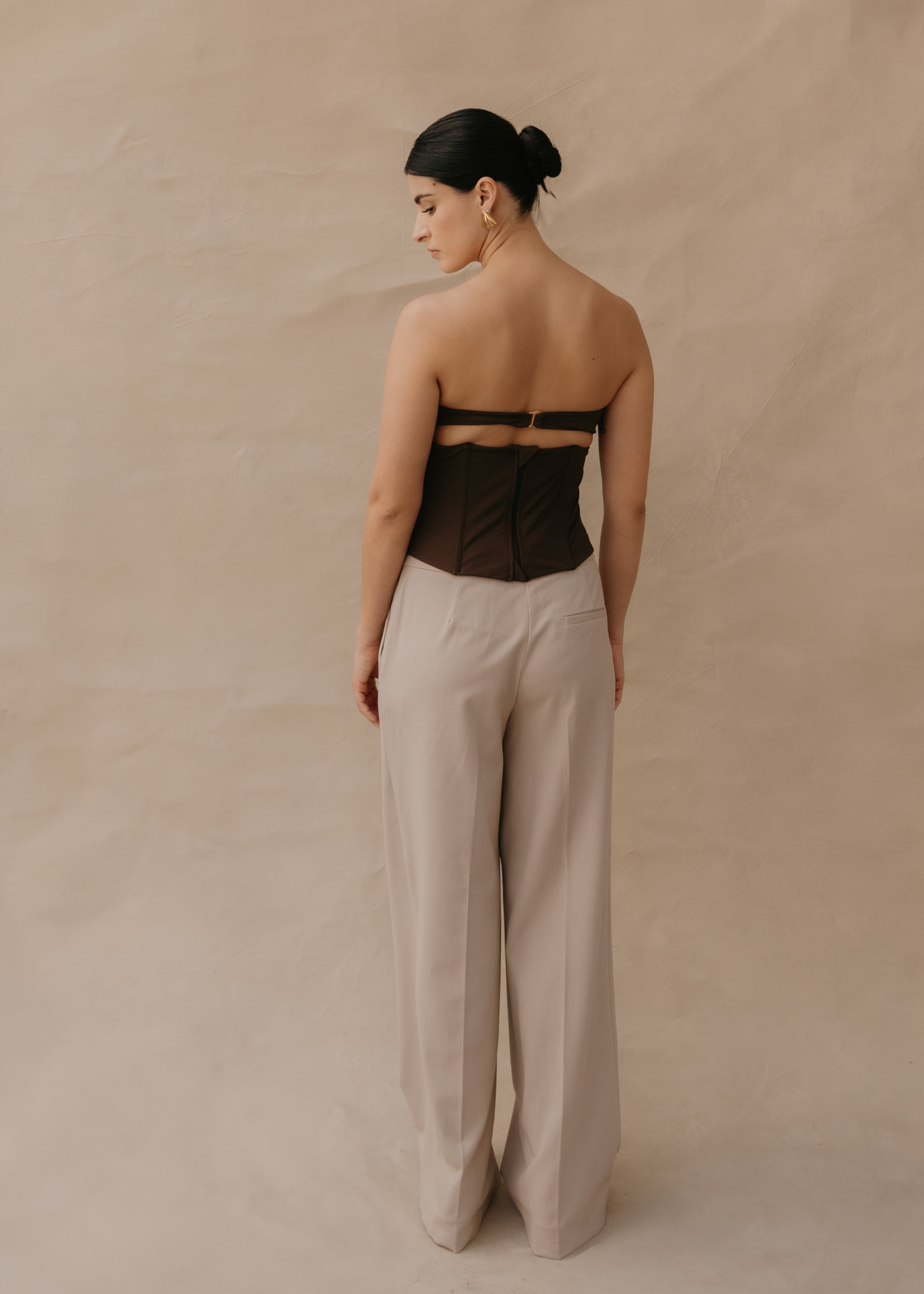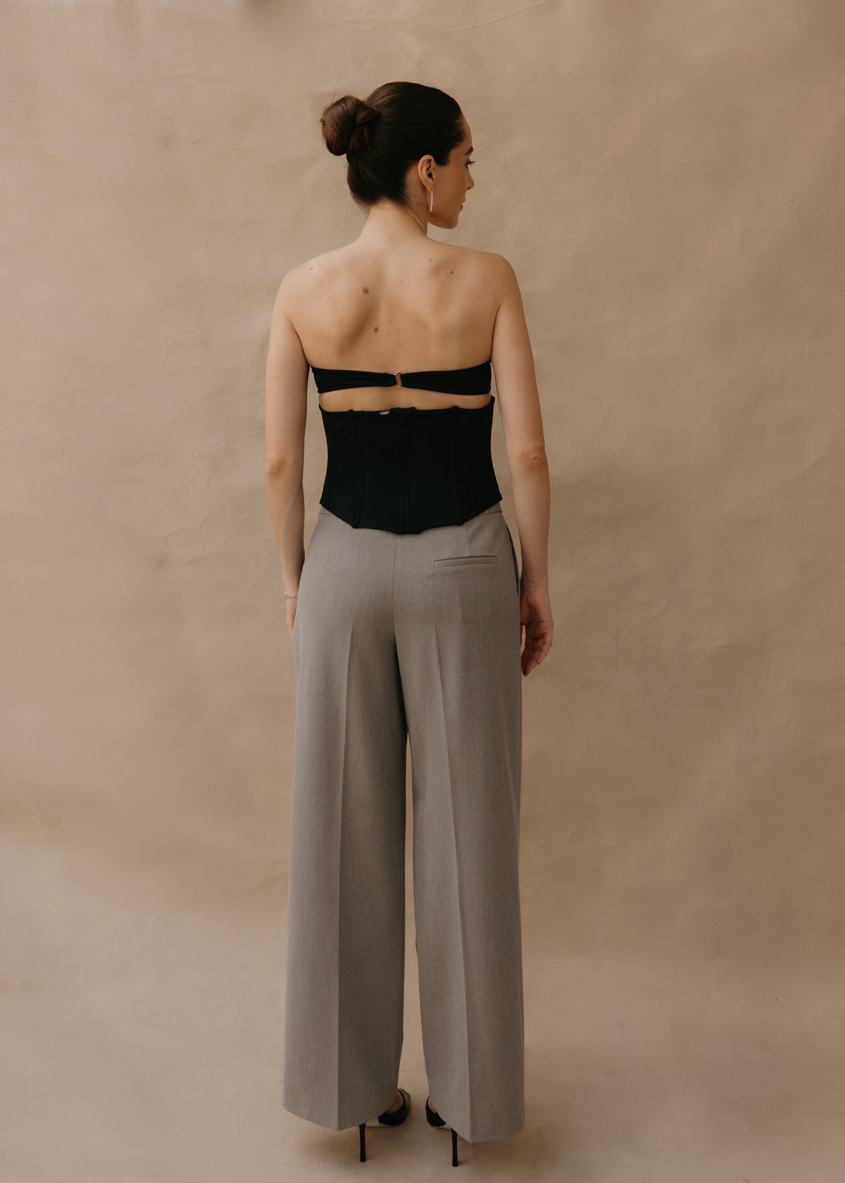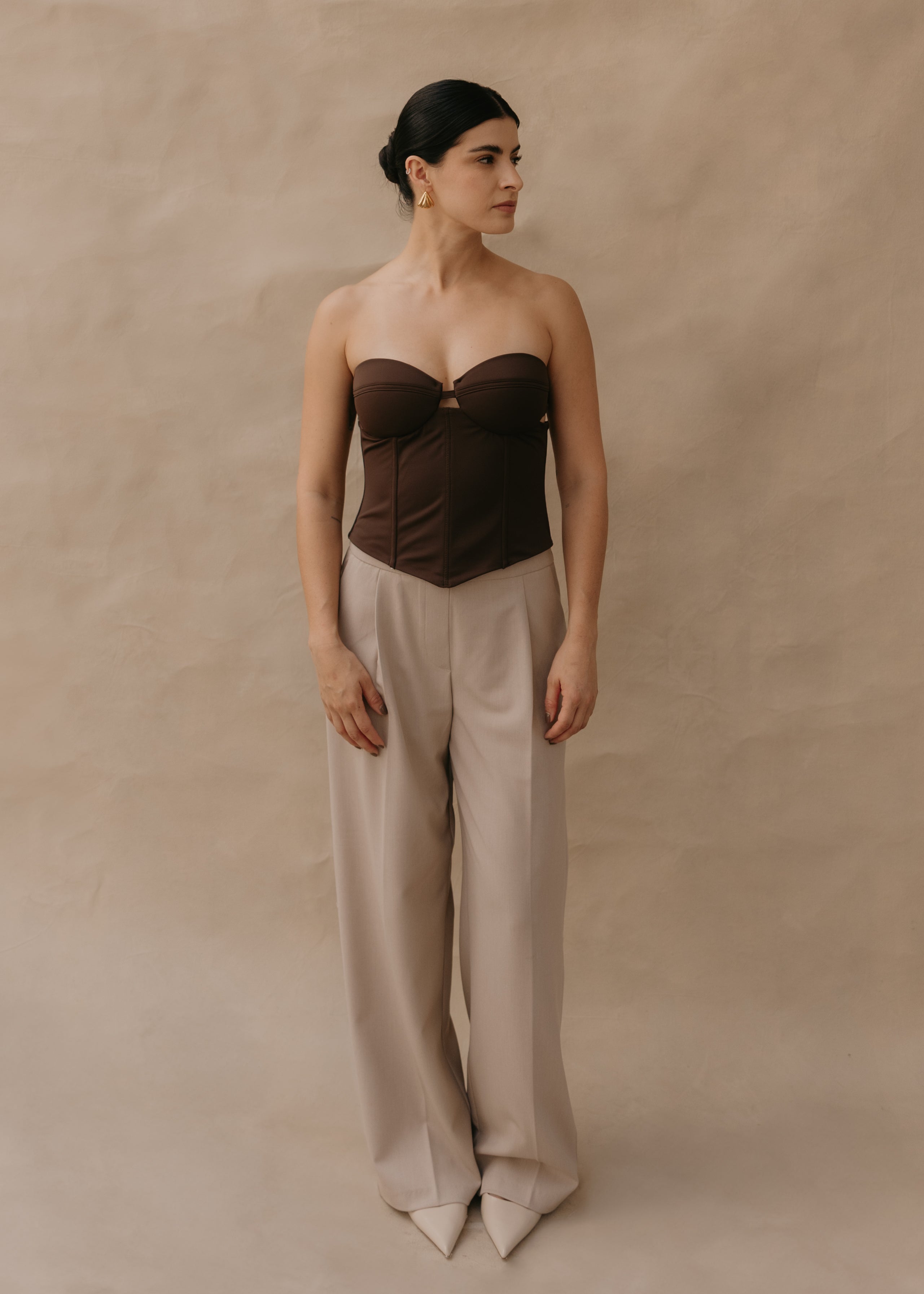 The Simona top is a strapless corset made from soft, structured Lycra, ideal for shaping and enhancing the silhouette. Its design incorporates internal boning that provides firm support and definition to the torso, achieving a flattering fit without sacrificing comfort. It's a versatile garment that can be worn with both formal and casual looks, becoming the focal point of any outfit.