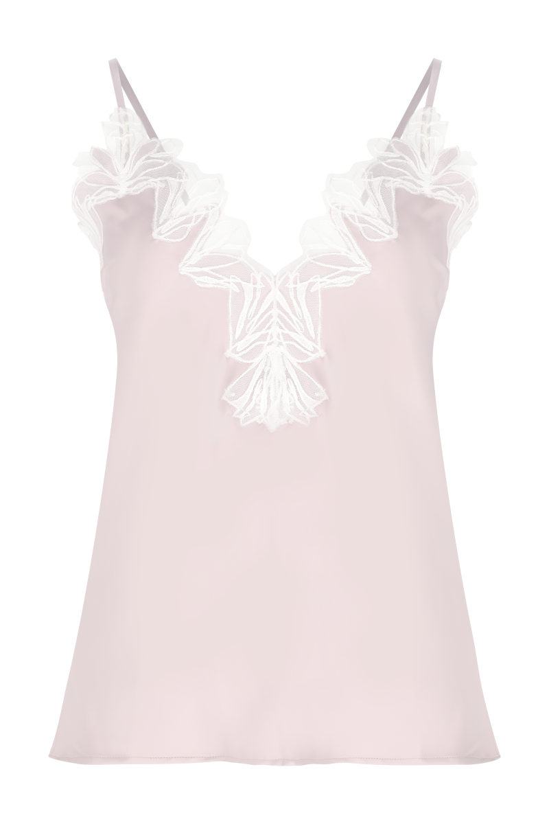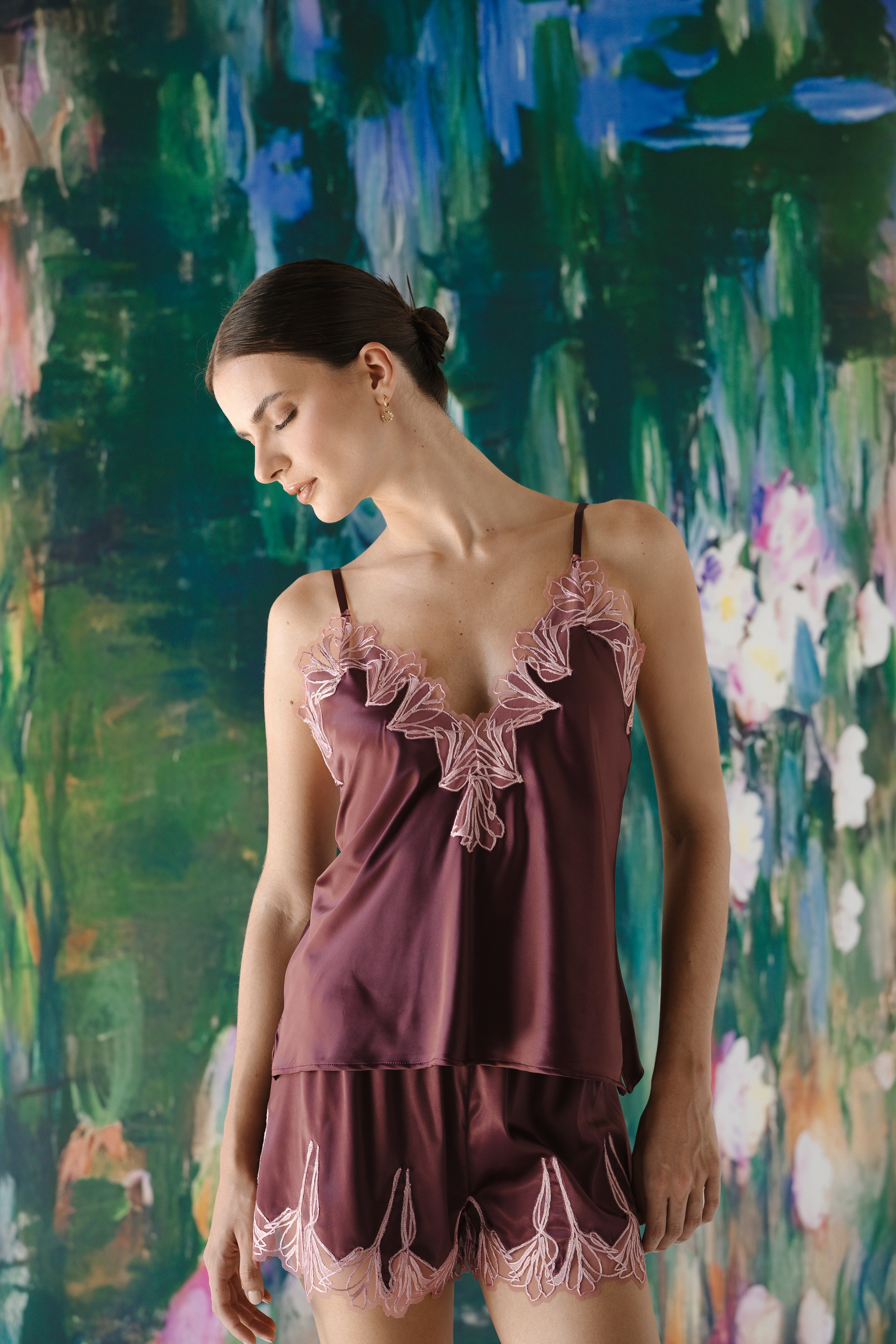 The "Sainte" top is crafted from satin with adjustable straps and delicate lace trim at the neckline. Versatile and comfortable for lounging at home, it pairs perfectly with the Sainte shorts; and for going out, you can combine it with the Printemps skirt to create a sophisticated outfit.