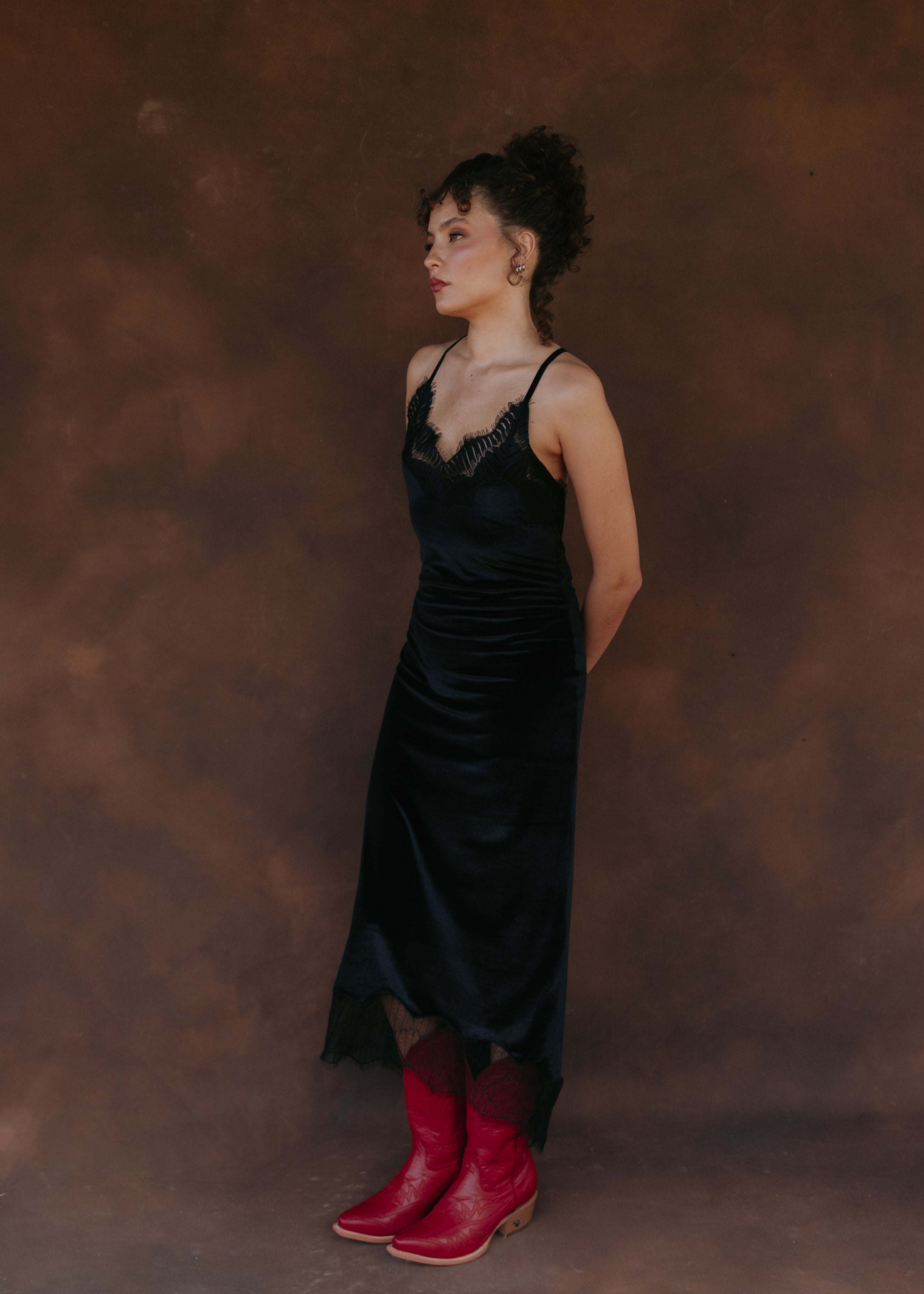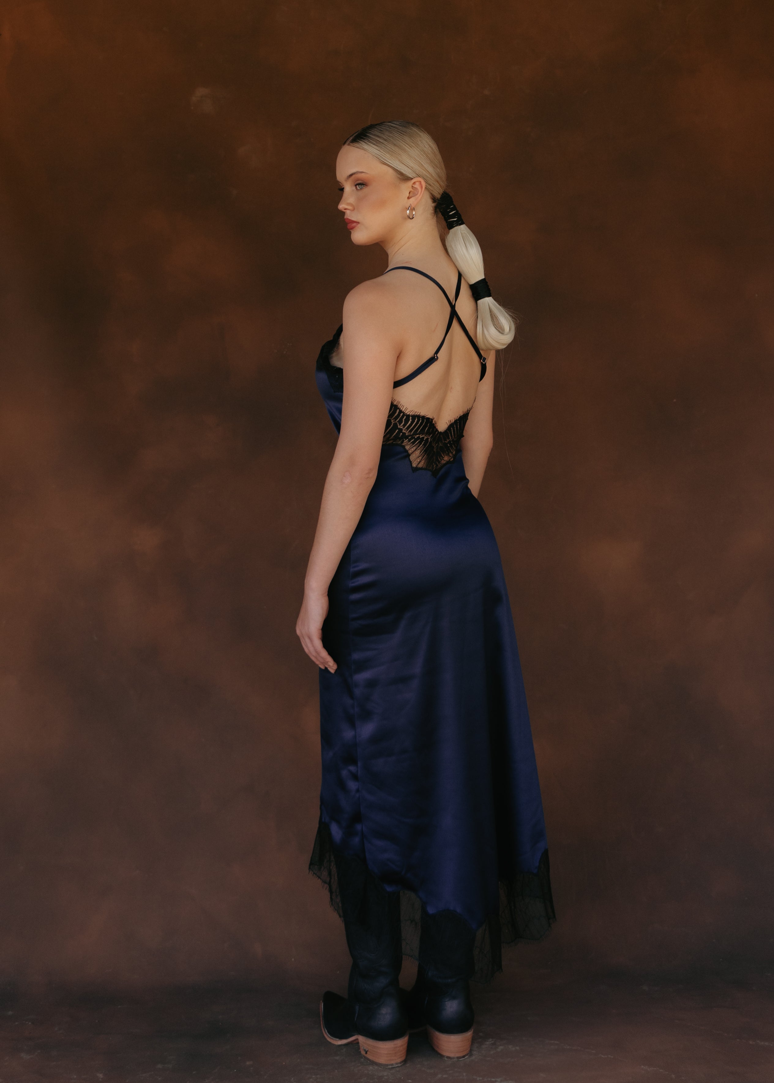 Satin midi dress with adjustable straps and lace appliqués at the front and back necklines, as well as the hem. Its design delicately accentuates the silhouette with a subtle shimmer. A romantic and timeless garment with lace details that enhance its femininity.
