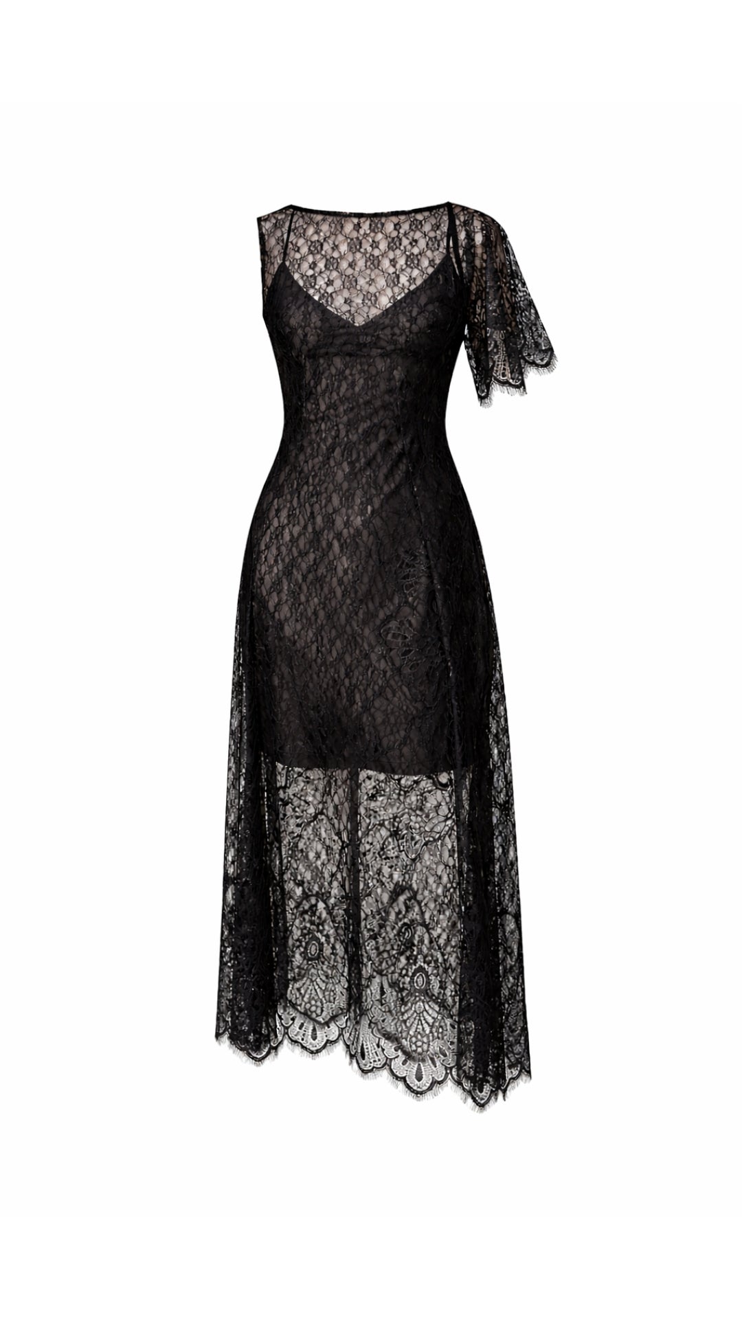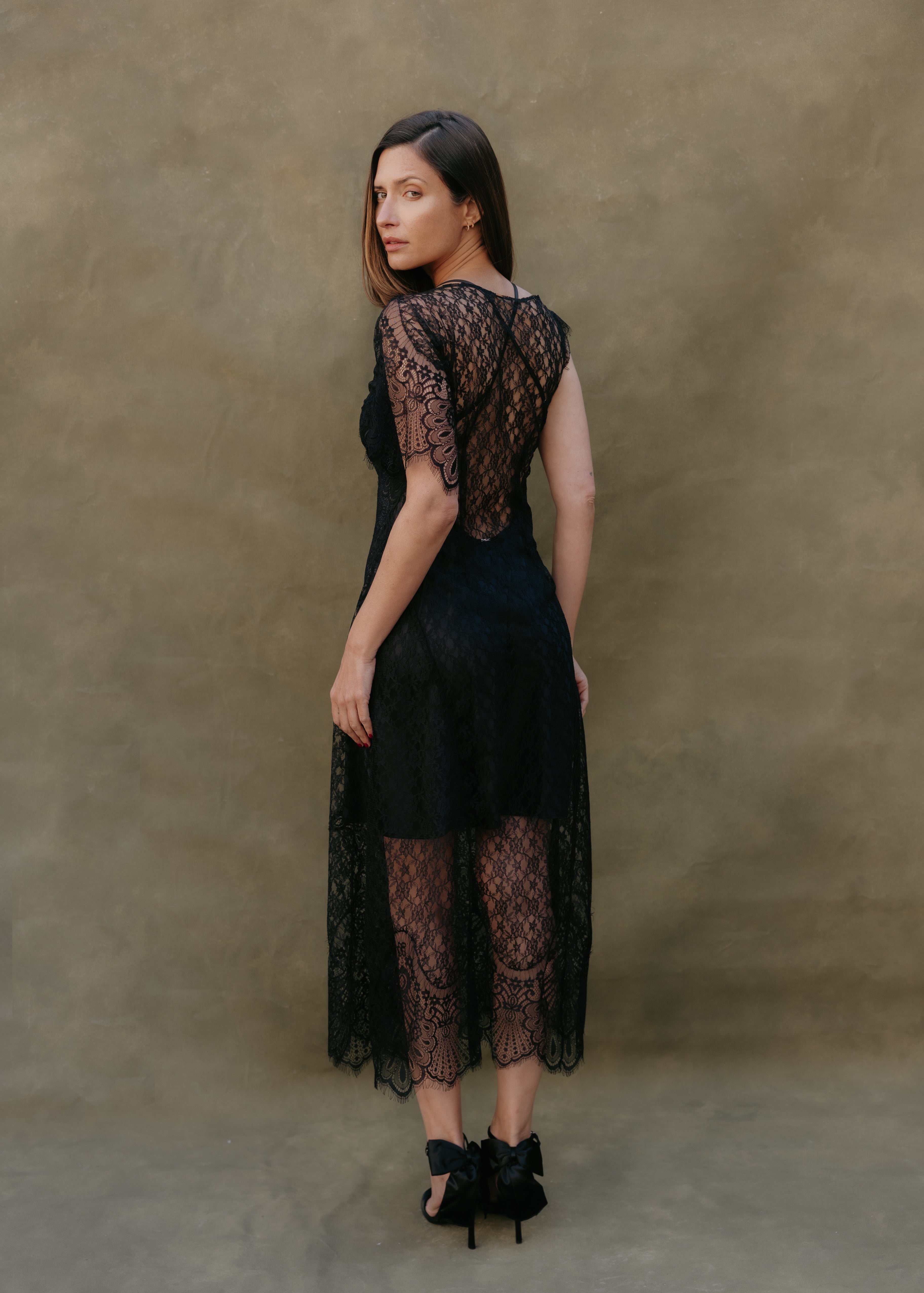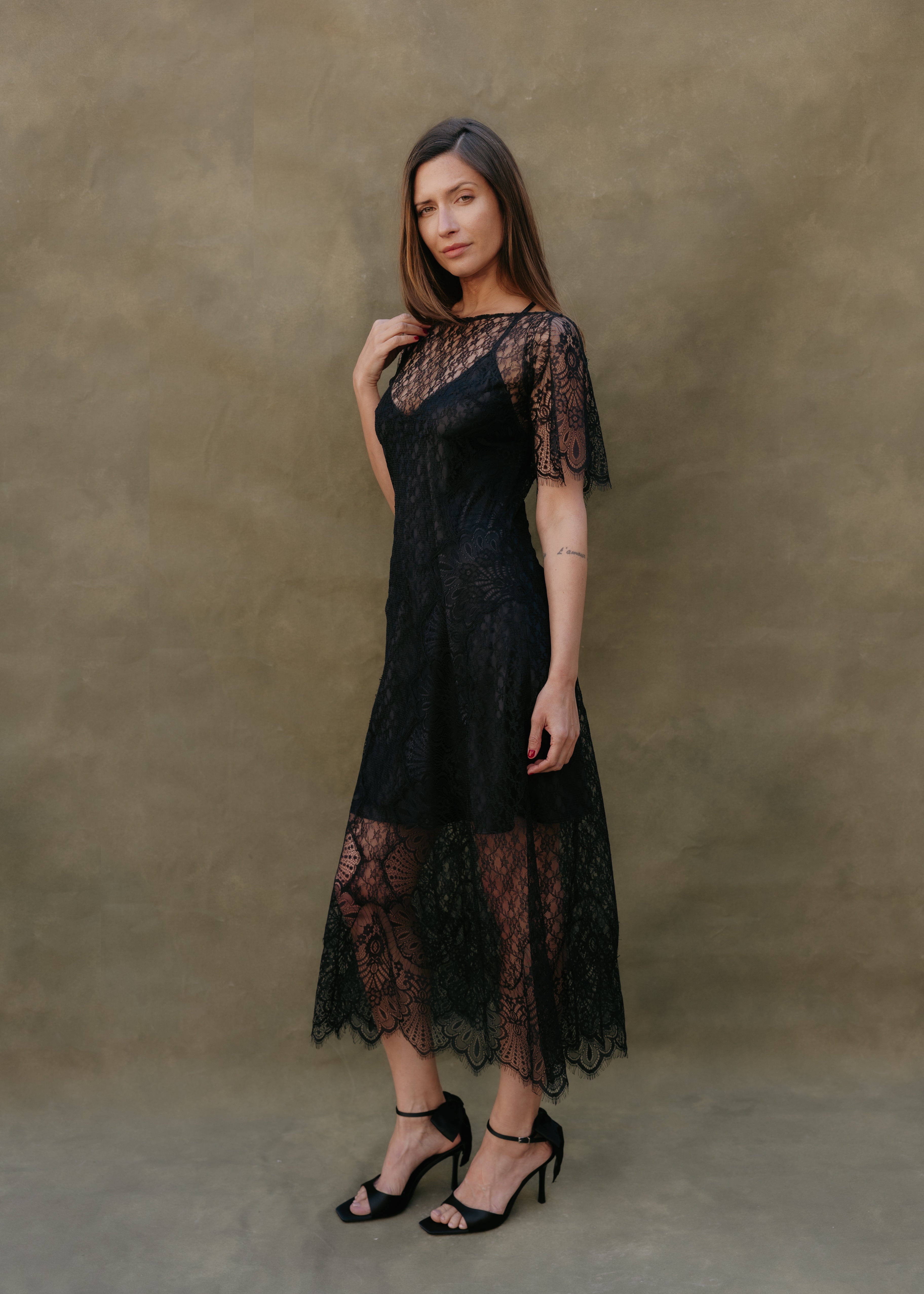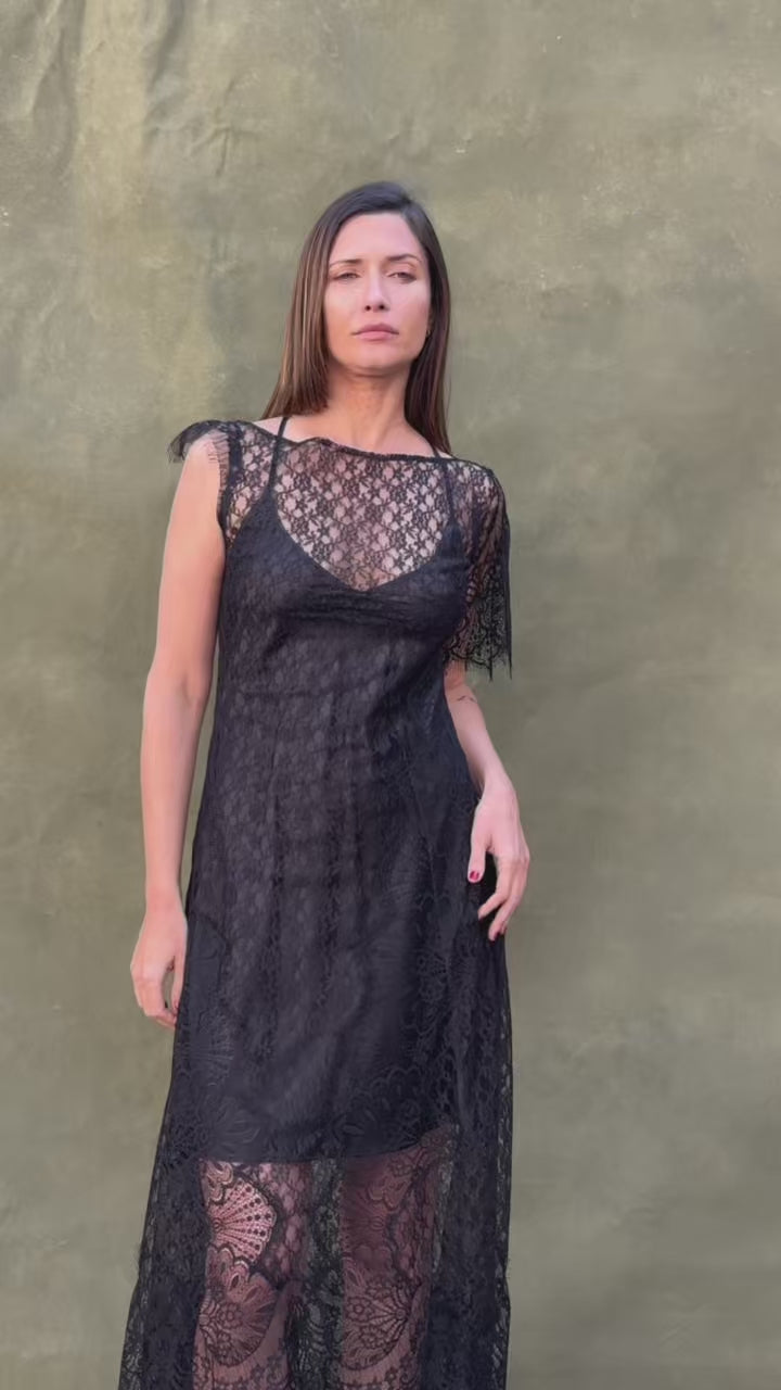 The Noemi dress in black floral lace stands out for its elegance and sophisticated character. Its soft, sheer lace creates a delicate and feminine effect that drapes the silhouette with lightness. The design allows it to be worn with a slip or lingerie underneath, adapting to different styles, while the asymmetrical sleeves and side zipper closure provide a comfortable fit and a contemporary touch.