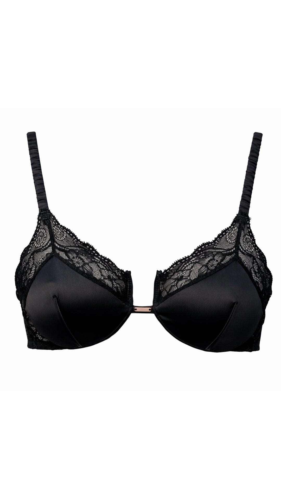 The Claire Bra in floral lace and black satin is a classic essential of elegant lingerie. Designed with unpadded cups and underwire for natural support, and adjustable straps for comfort and versatility. A sophisticated and timeless piece that enhances femininity with confidence and style.