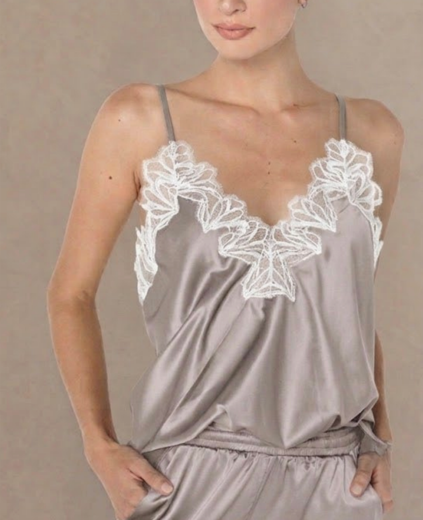 The "Sainte" top is crafted from satin with adjustable straps and delicate lace trim at the neckline. Versatile and comfortable for lounging at home, it pairs perfectly with the Sainte shorts; and for going out, you can combine it with the Printemps skirt to create a sophisticated outfit.