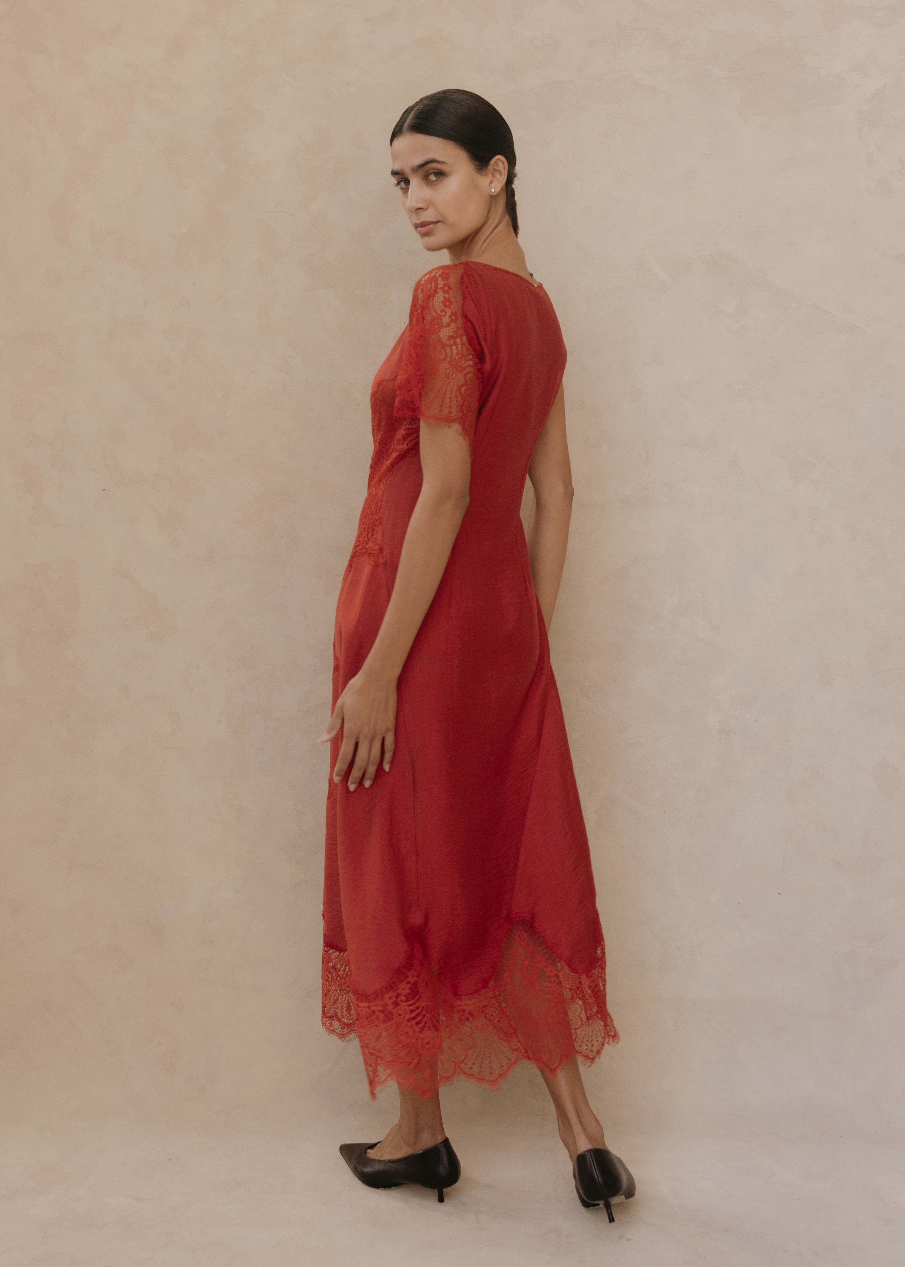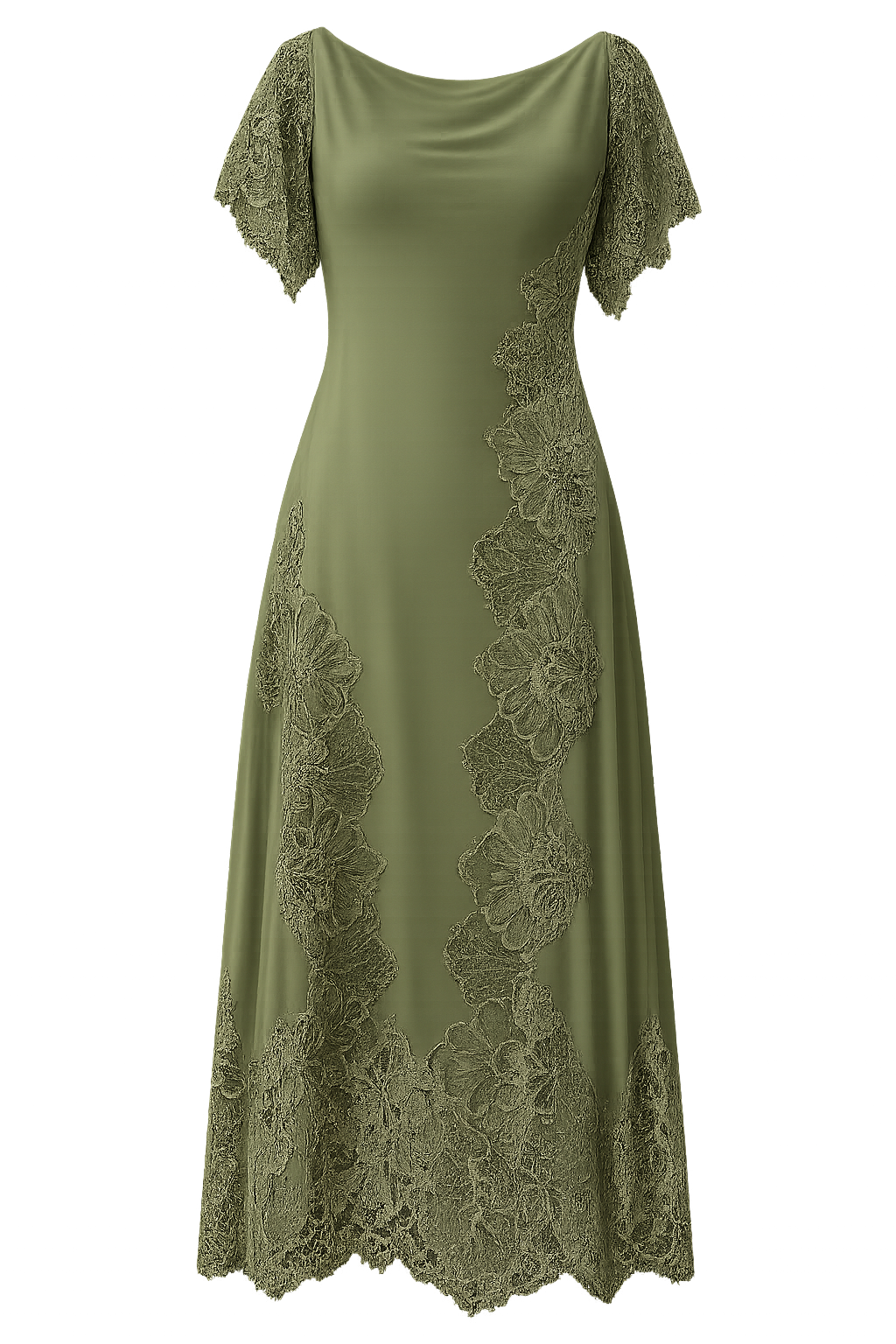 Asymmetrical midi dress crafted from ivory linen, featuring a short sleeve on one side and lace appliqués on the front and back. It has a side zip closure that elegantly accentuates the silhouette. A distinctive and sophisticated design, ideal for special occasions with a refined and luminous air.