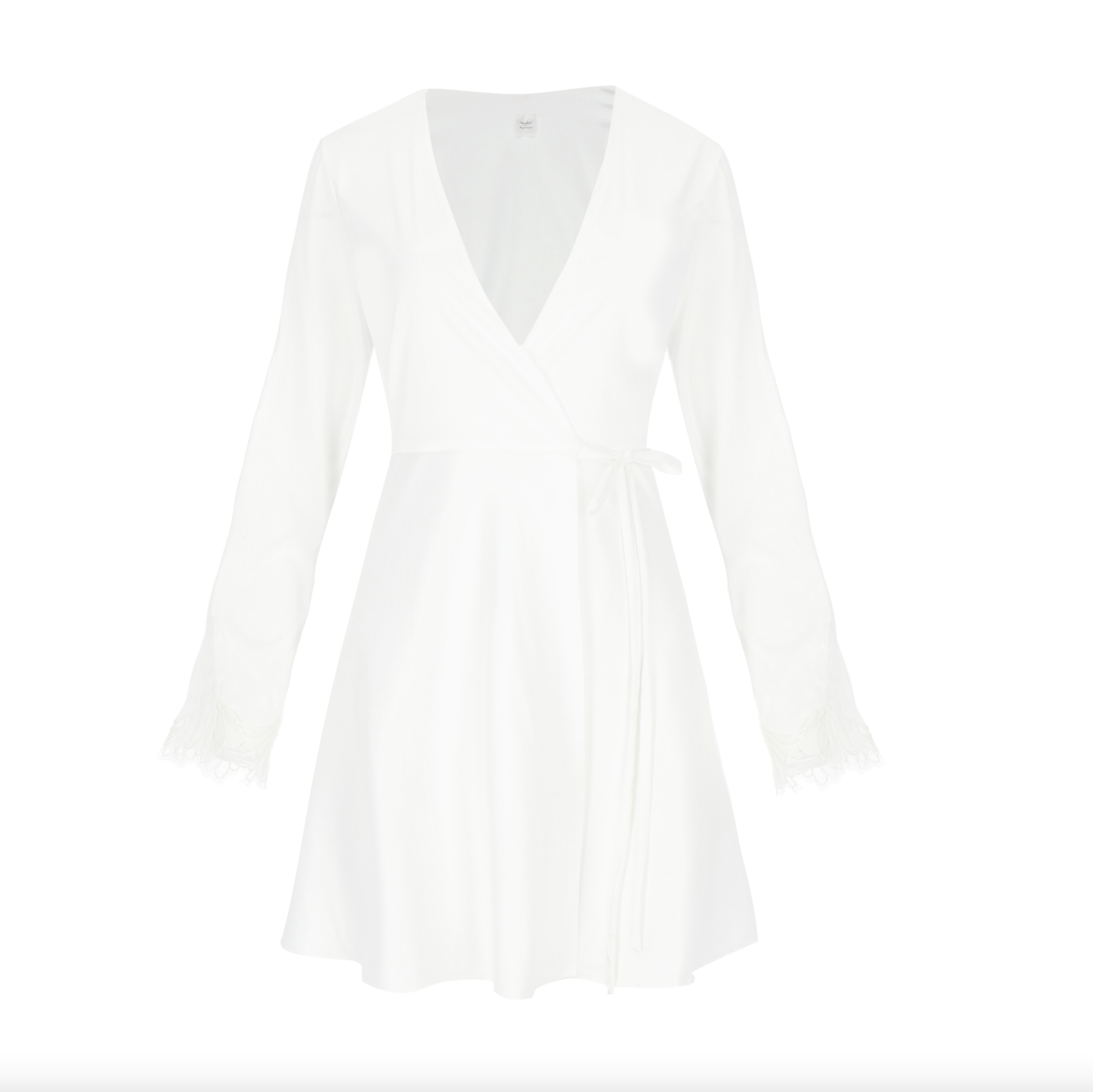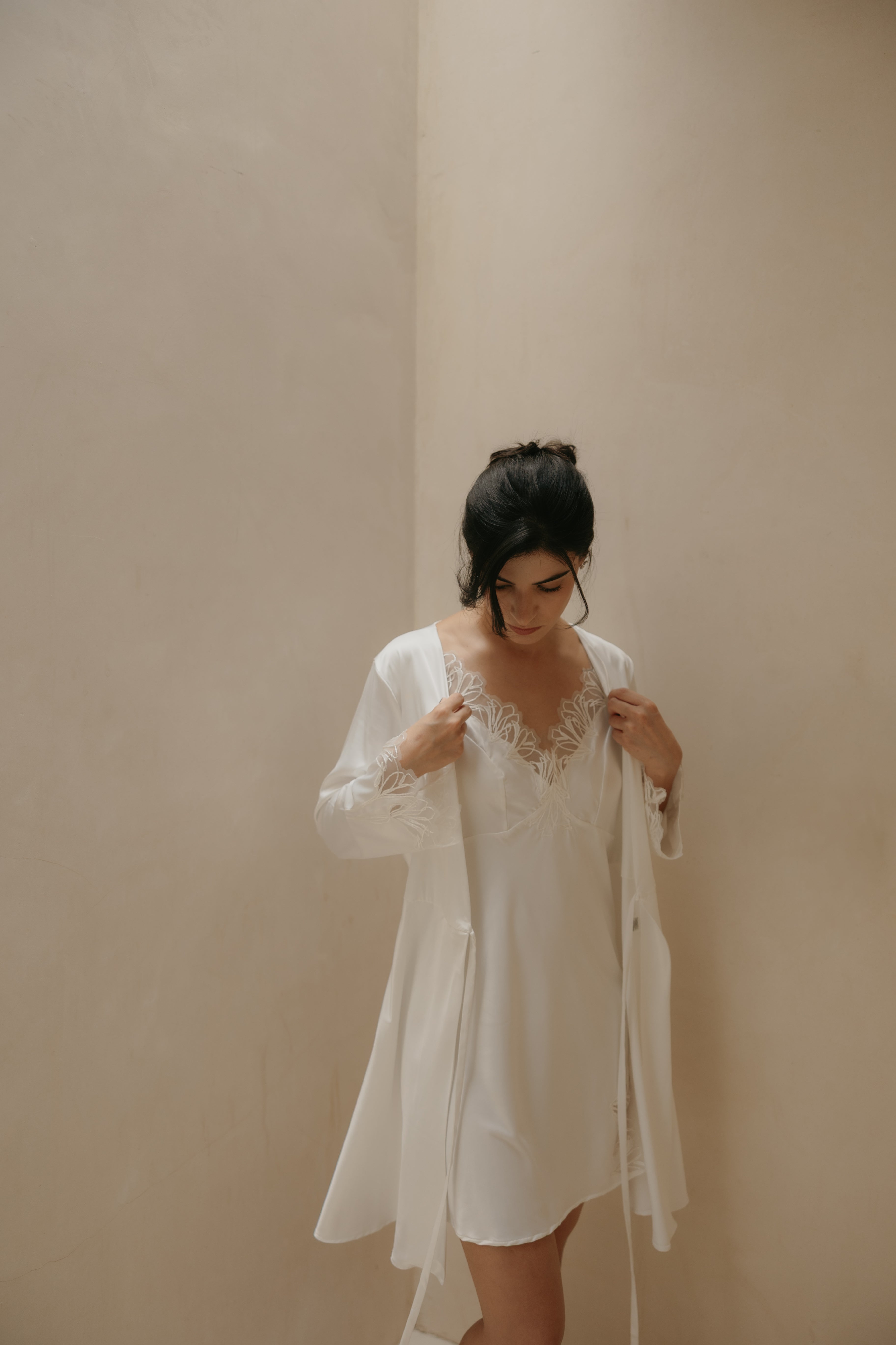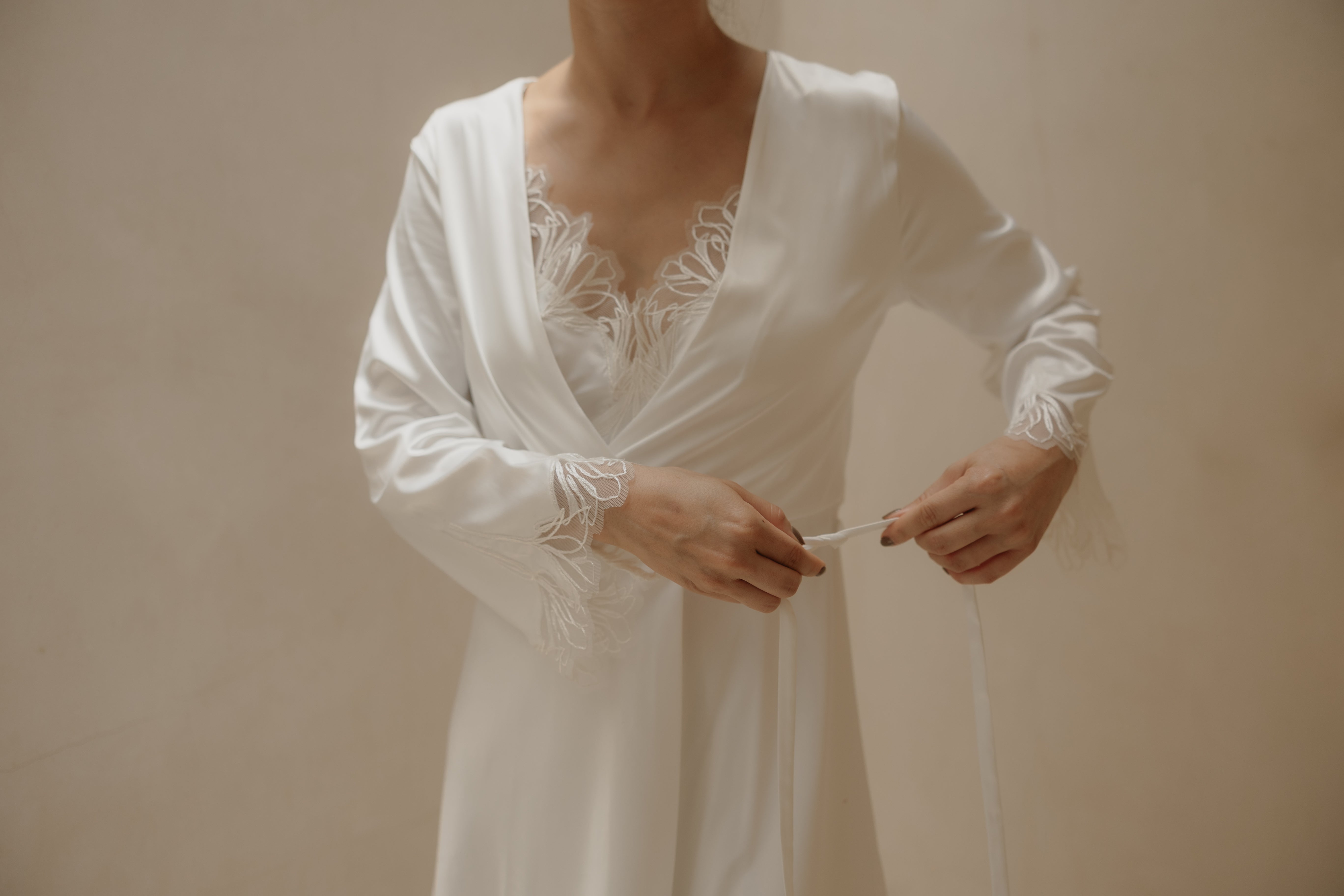 The "Agatha" robe in stretch satin is ideal for relaxing at home in ultimate comfort and style. Its delicate lace details and soft drape make it the perfect complement for getting ready on your special day, like your wedding.