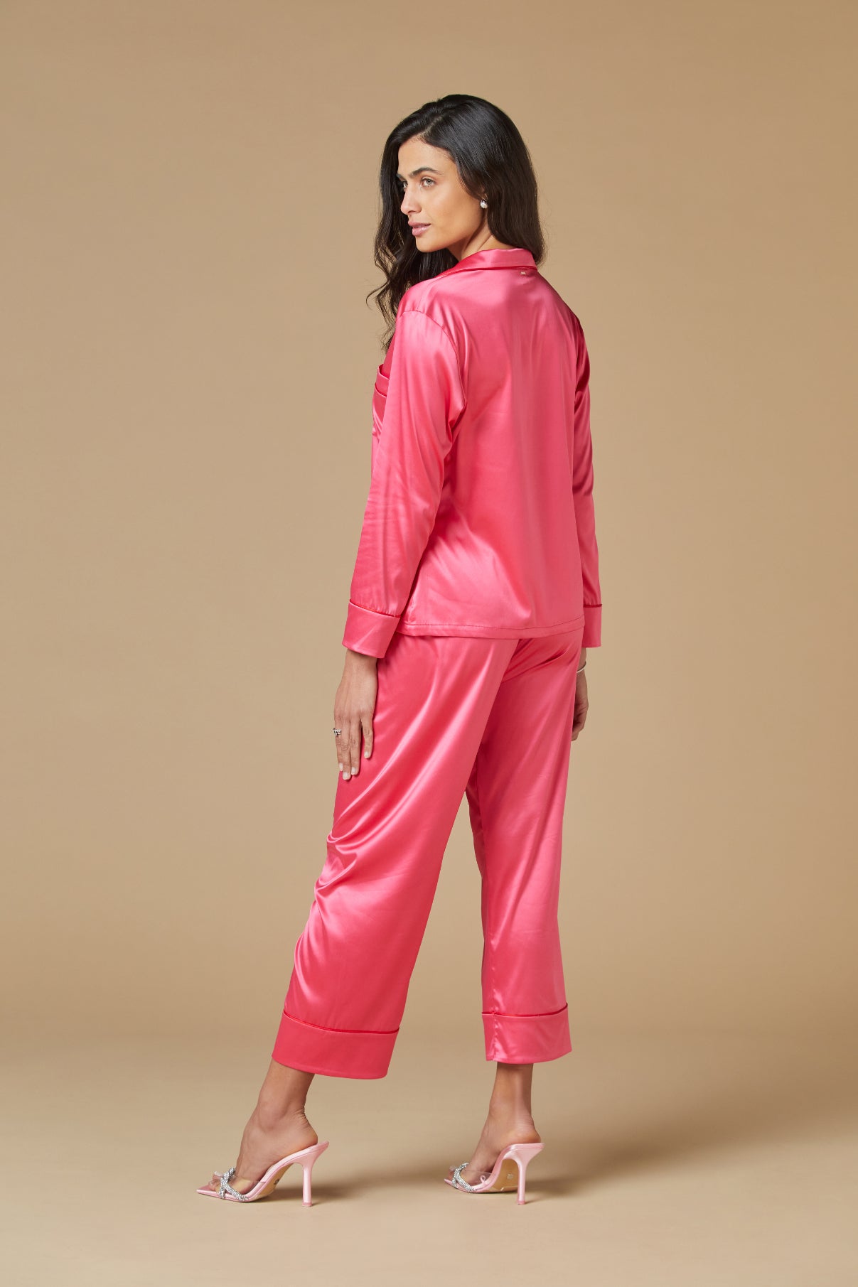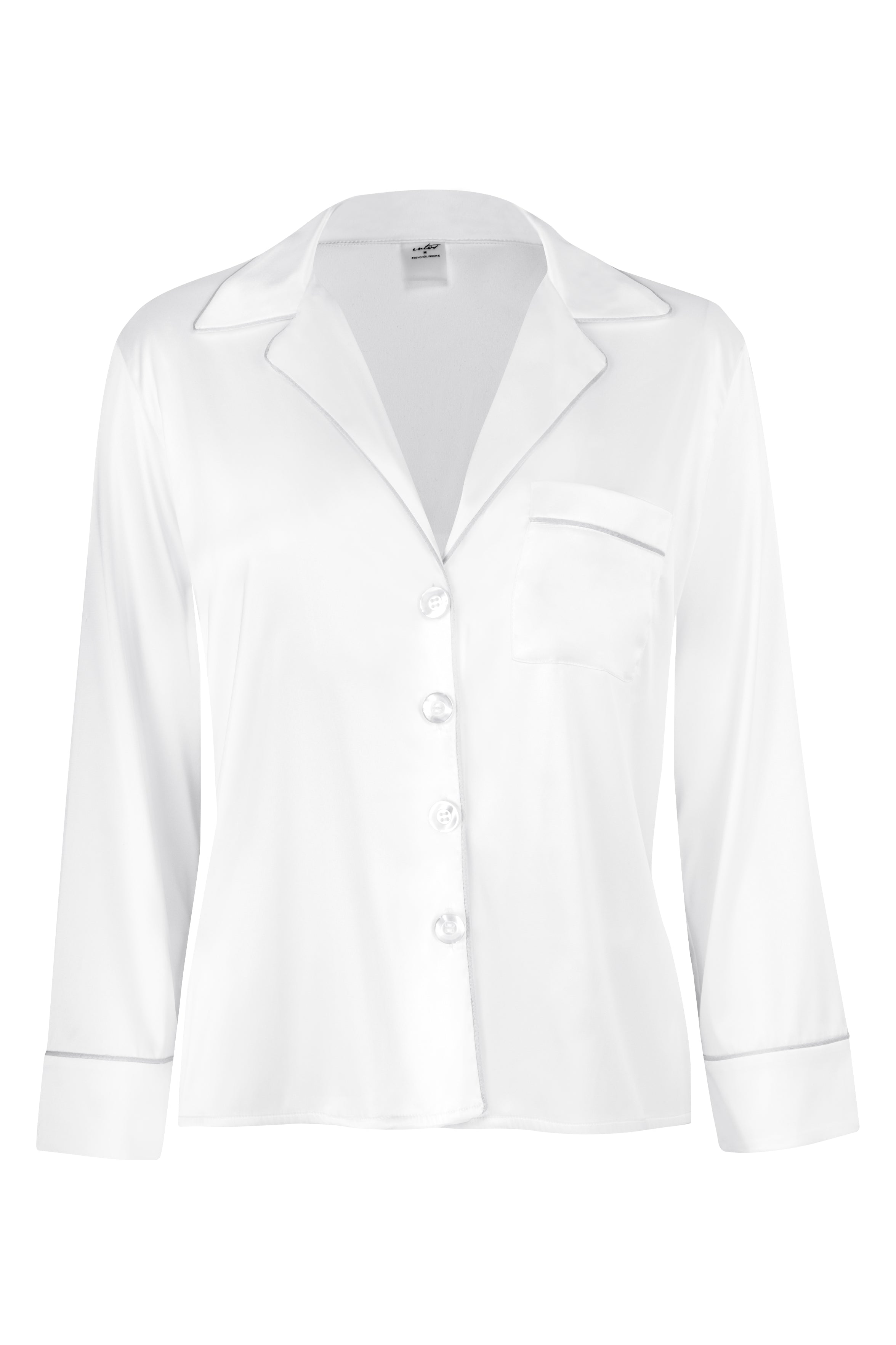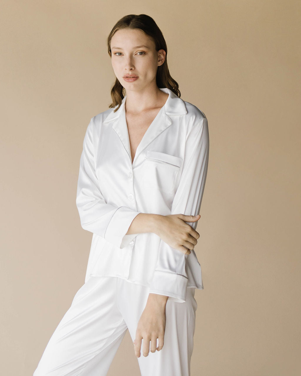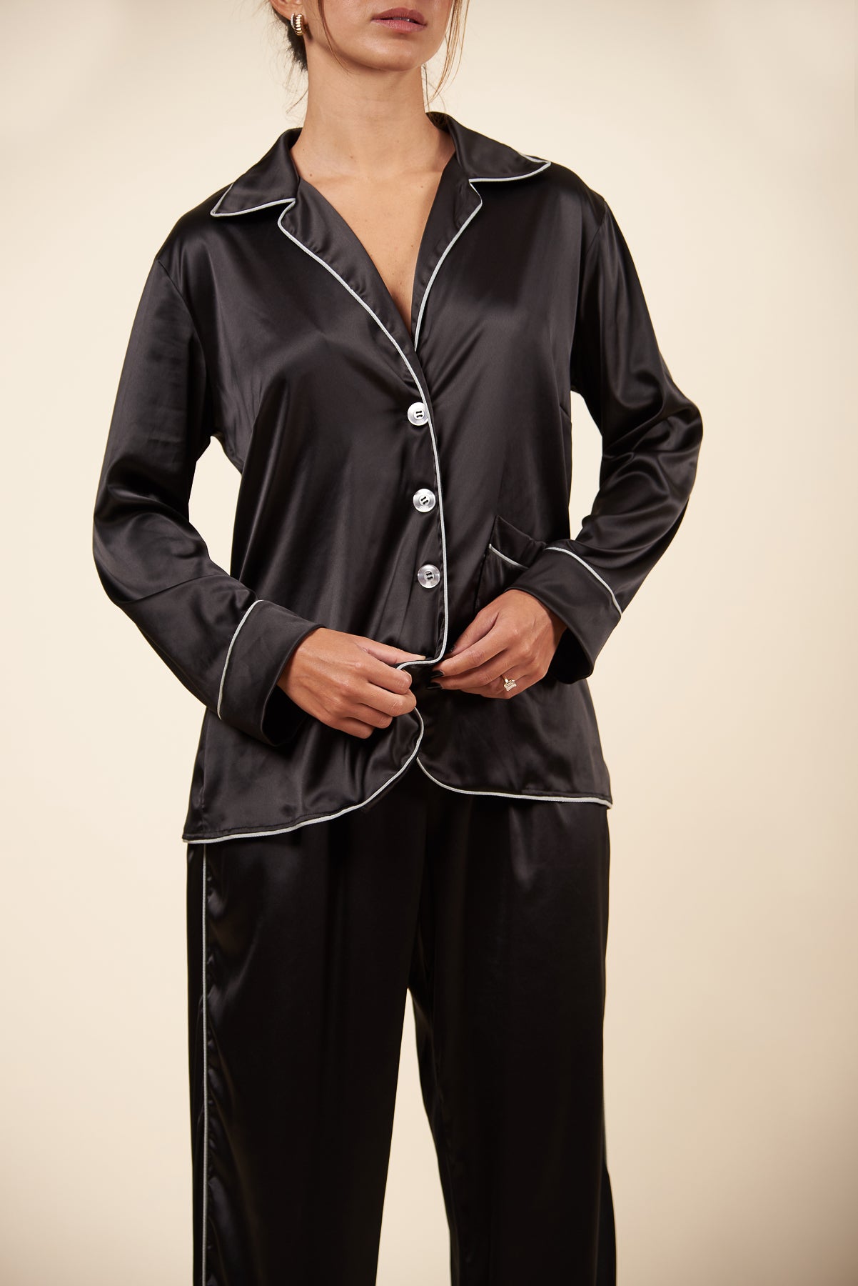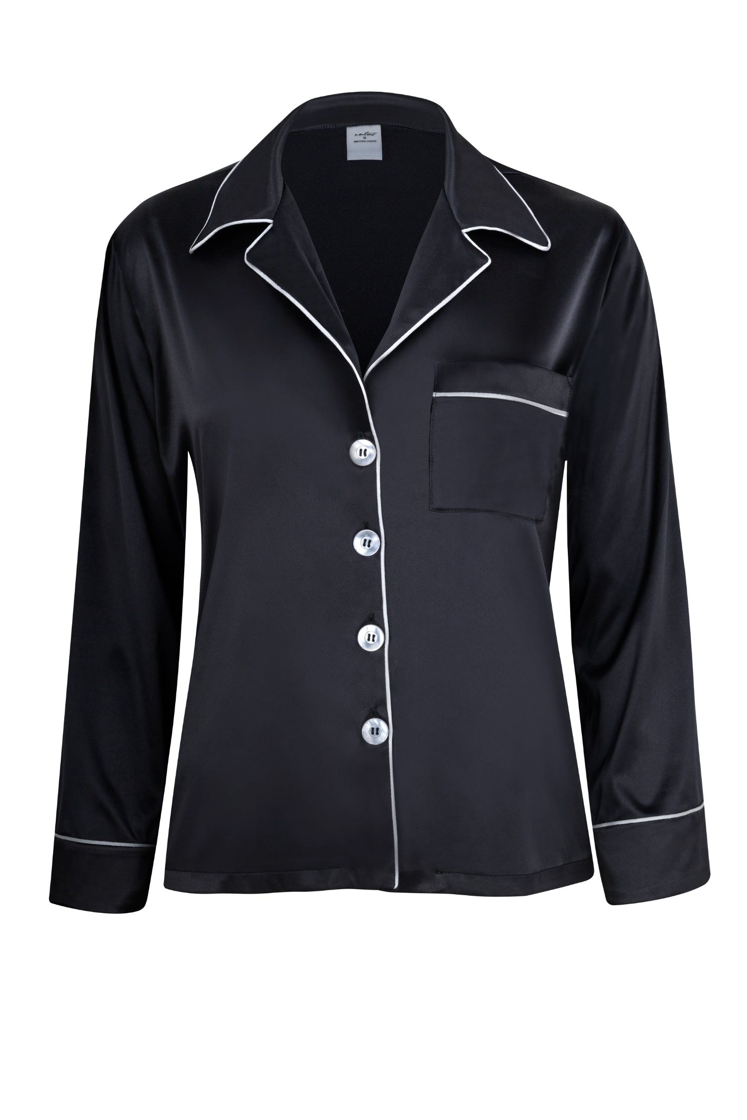 Introducing the "CHAMBRE BLOUSE," crafted from stretch satin with long sleeves and front buttons. It features colored piping along the edges, offering a luxuriously silky feel and elegant drape, perfect for pairing with the "CHAMBRE PANTS" to add sophistication to your pajama collection.