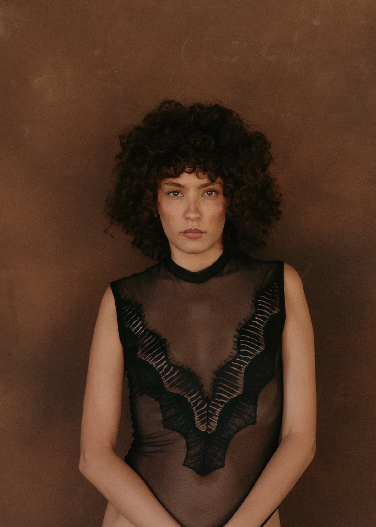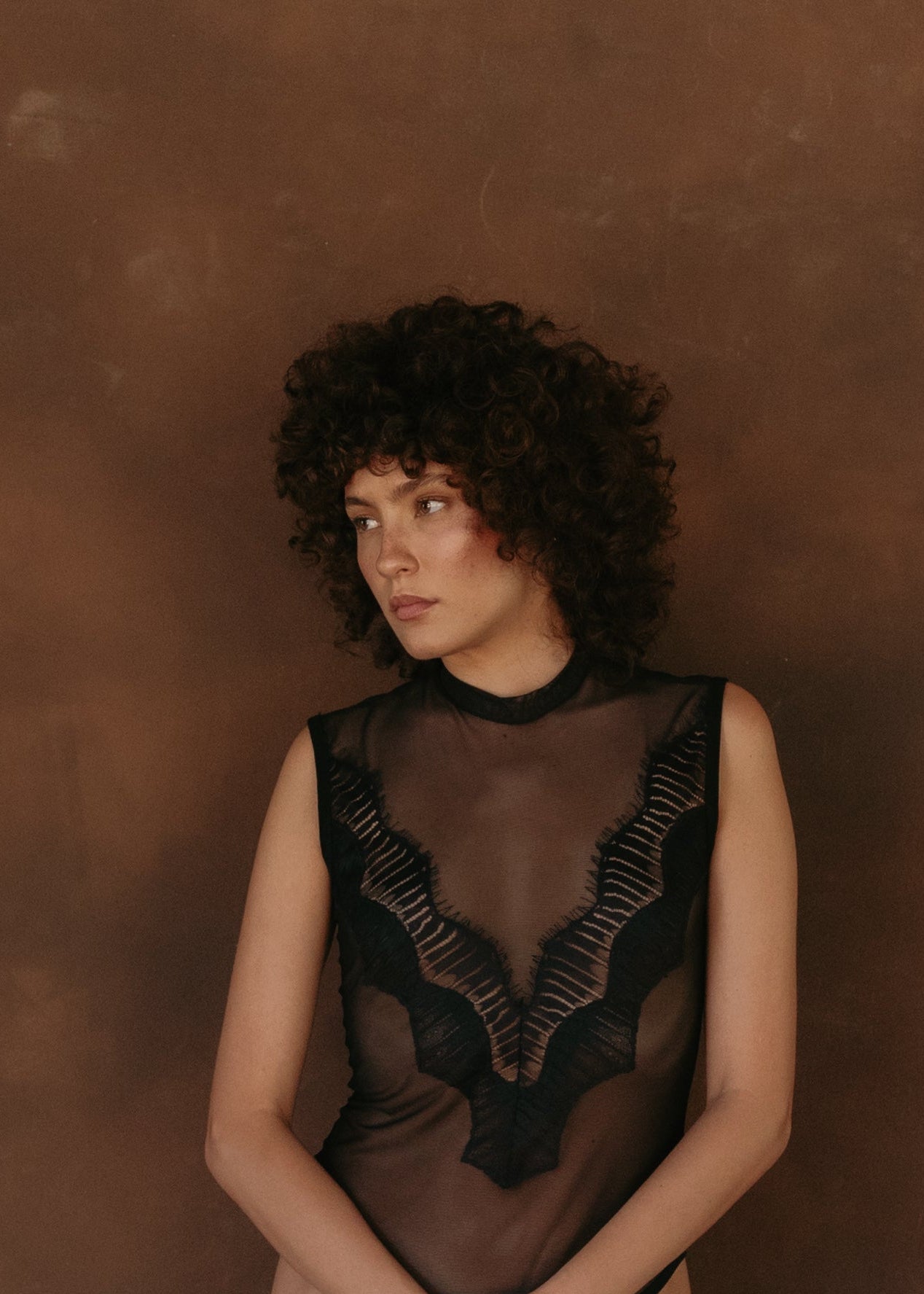 A mesh bodysuit with a V-shaped lace appliqué at the front neckline. It features a snap closure at the bottom. A sophisticated garment that combines sheer fabric and structure with a feminine touch.