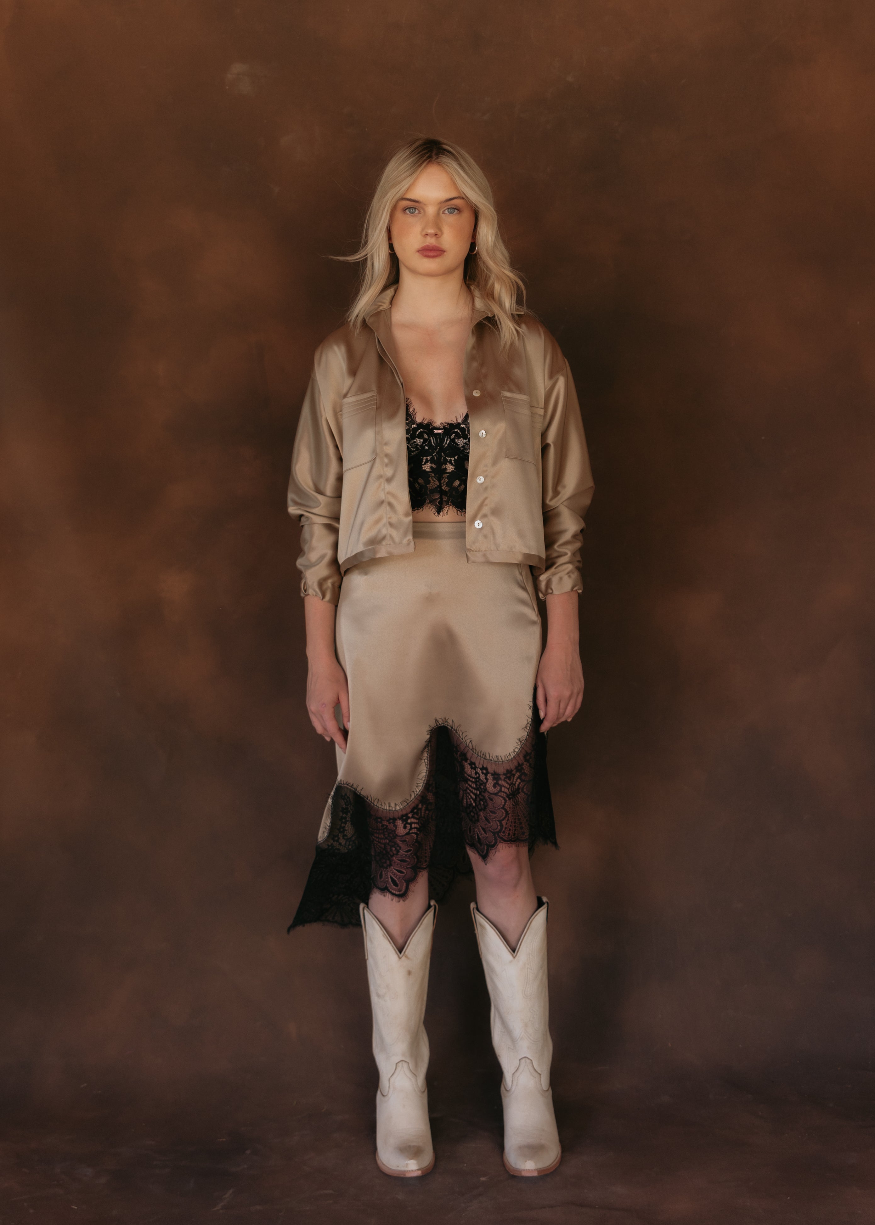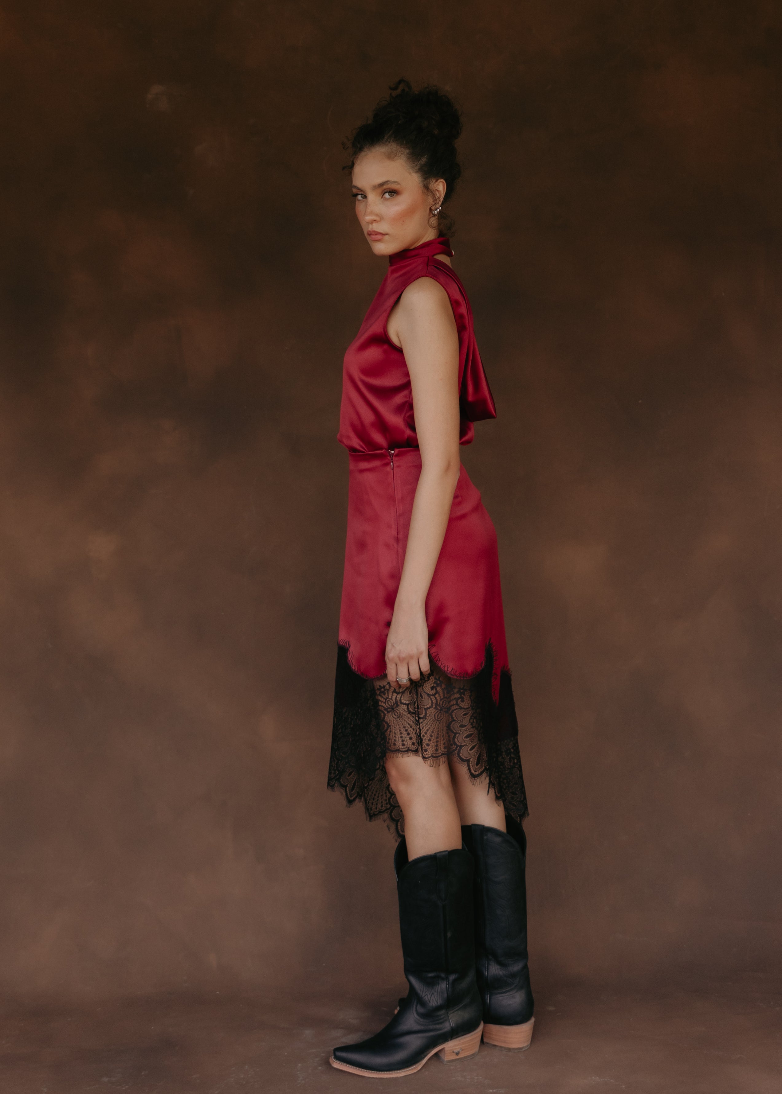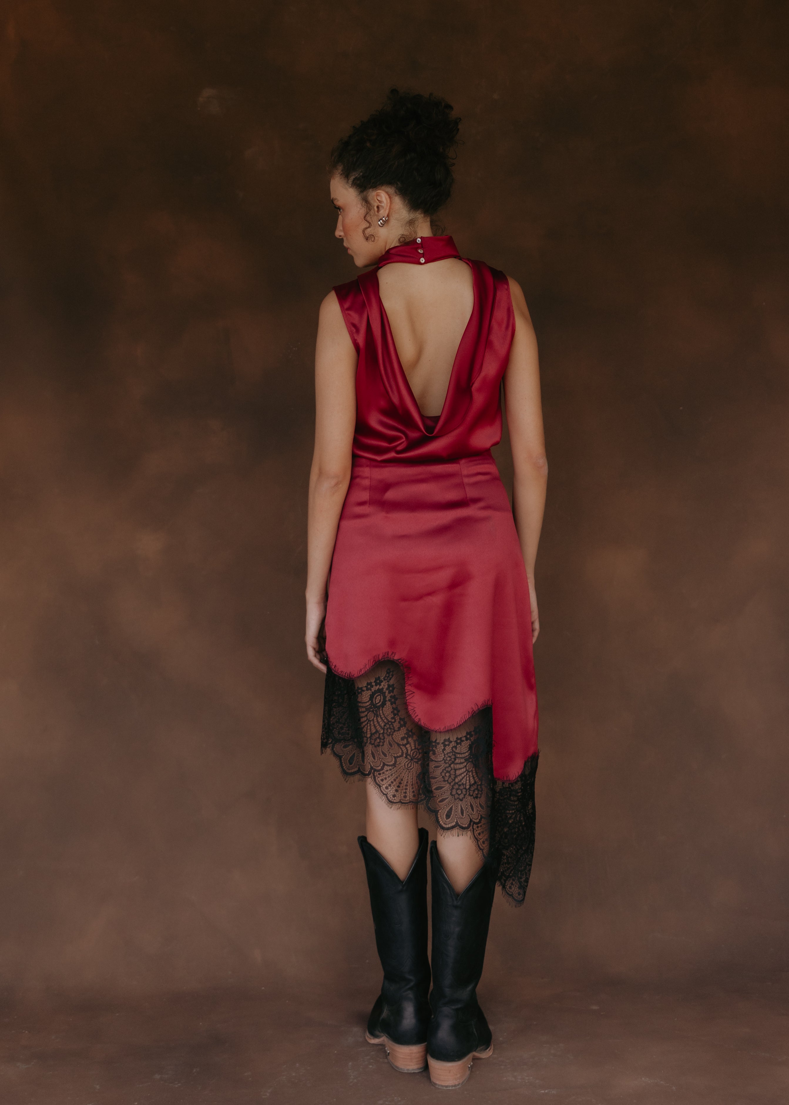 Asymmetrical short skirt made of satin with lace appliqués at the hem. It features an adjustable waist closure that enhances the figure. A modern and sensual piece with a touch of elegance.