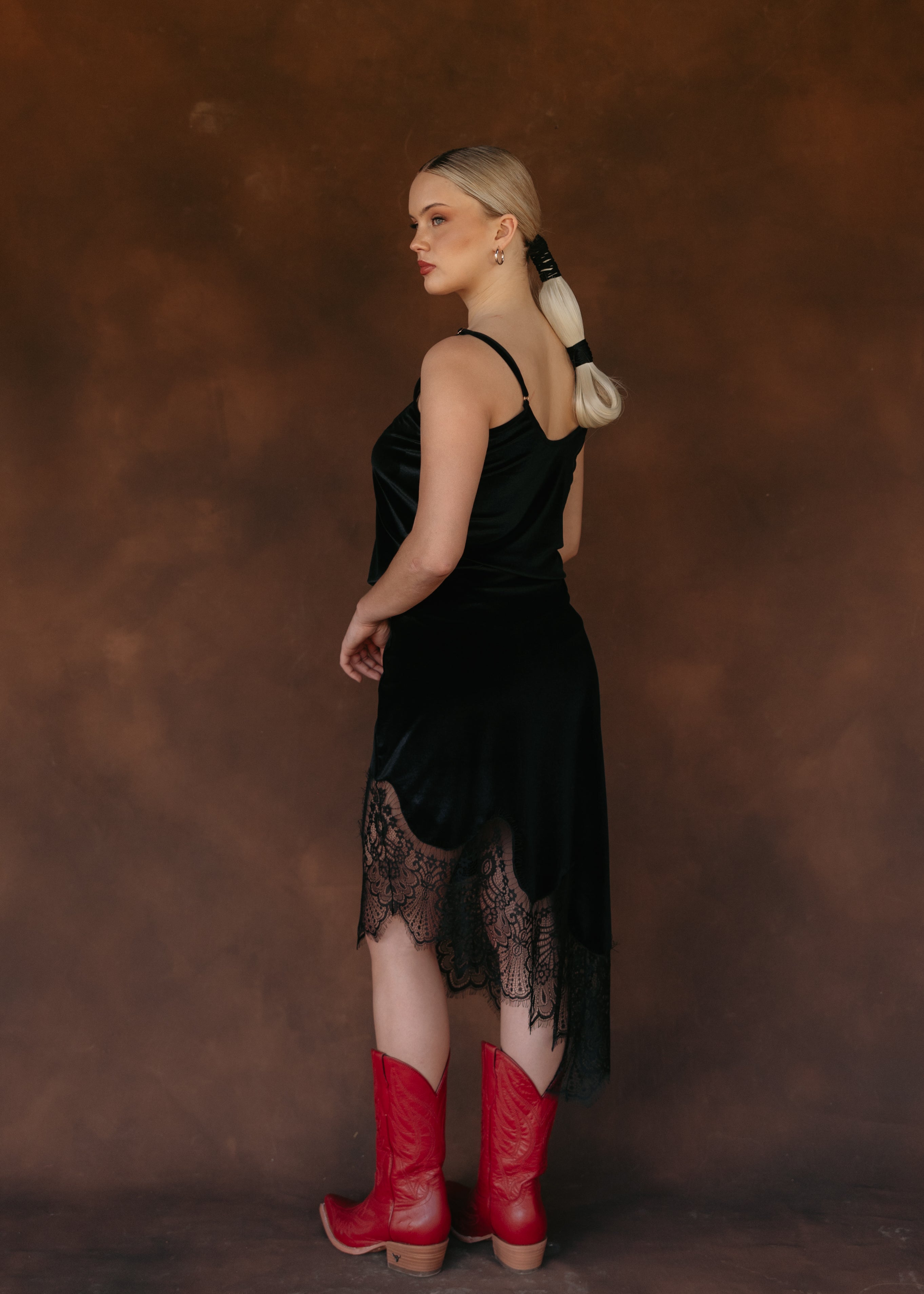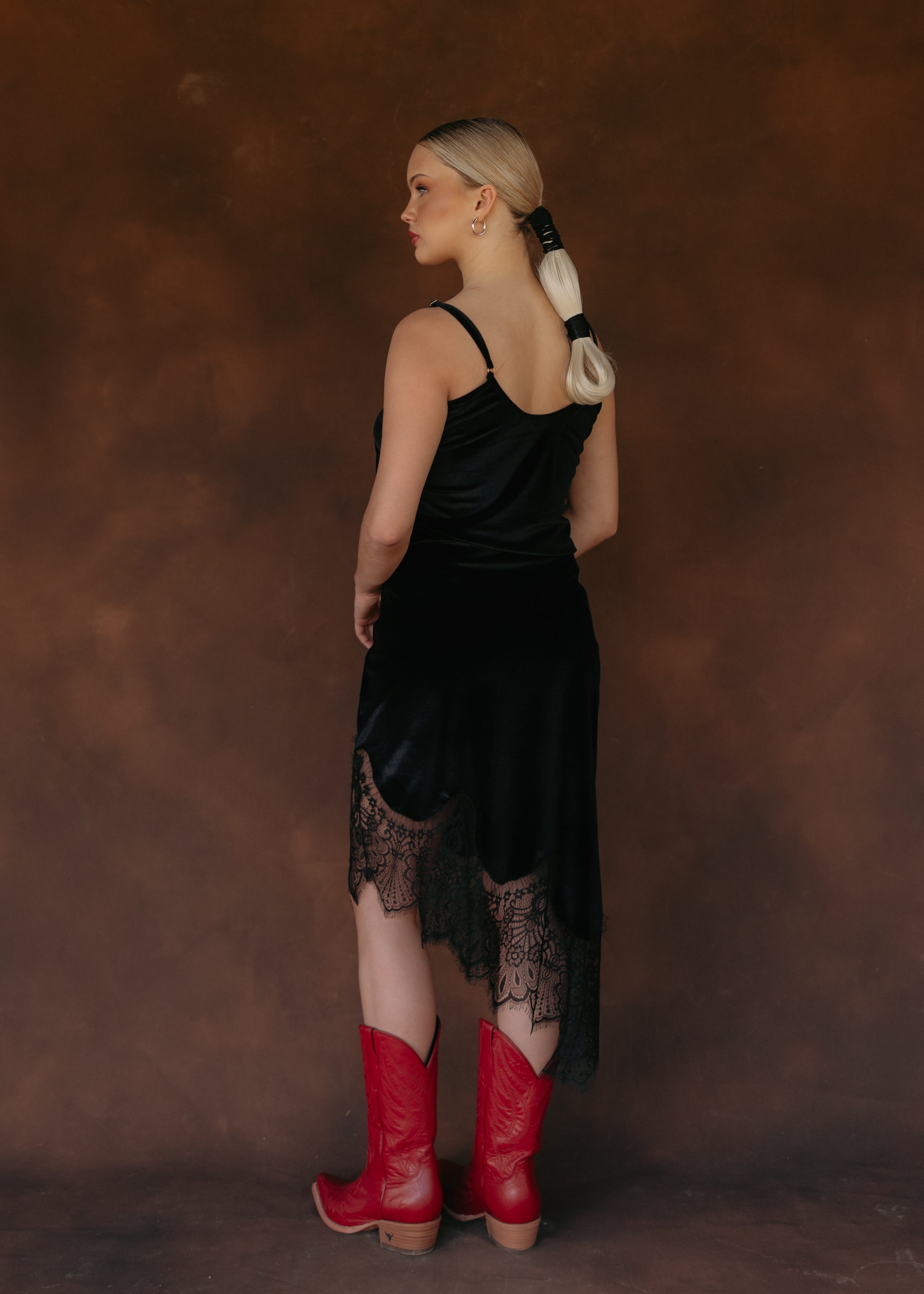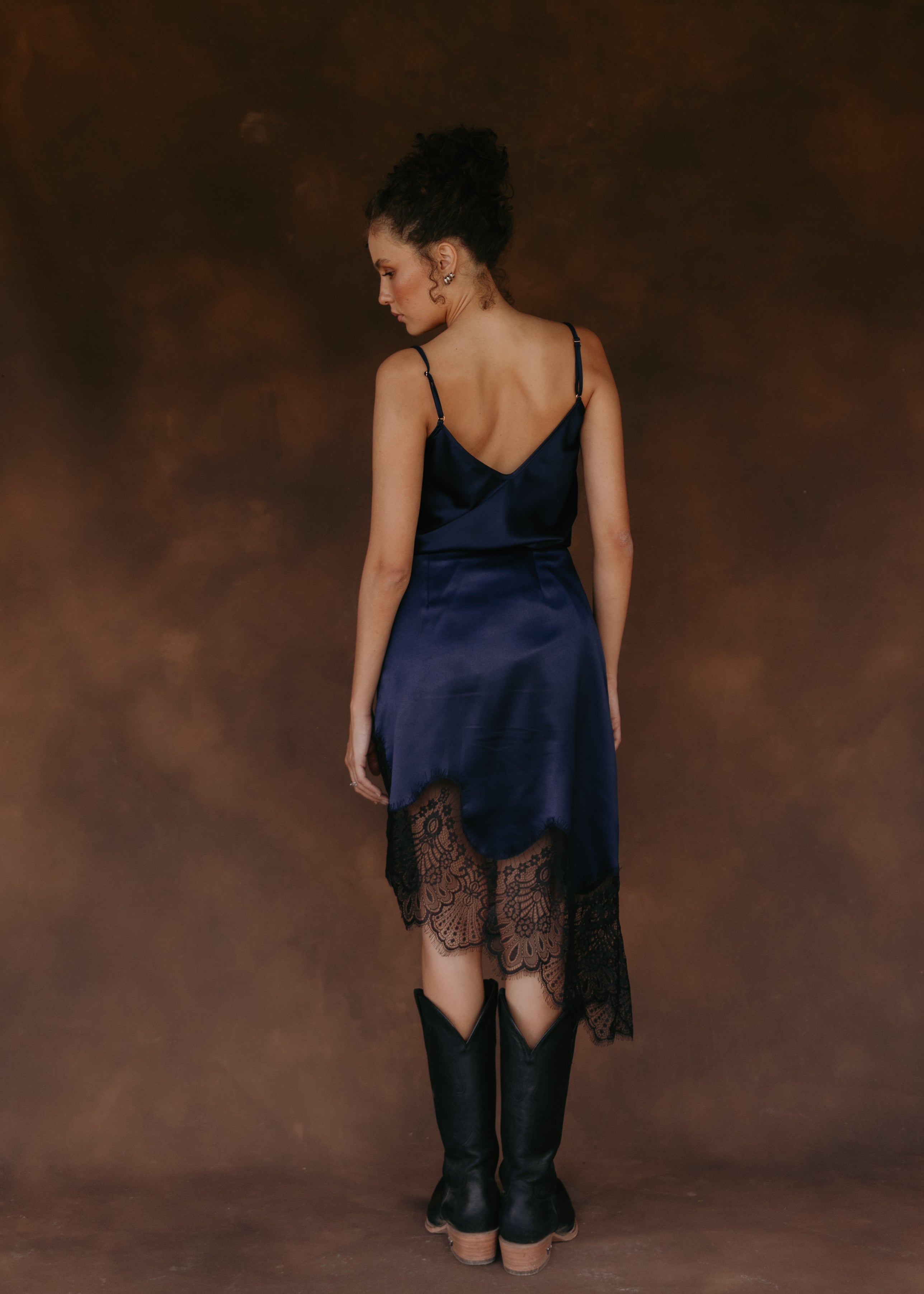 Asymmetrical short skirt made of satin with lace appliqués at the hem. It features an adjustable waist closure that enhances the figure. A modern and sensual piece with a touch of elegance.