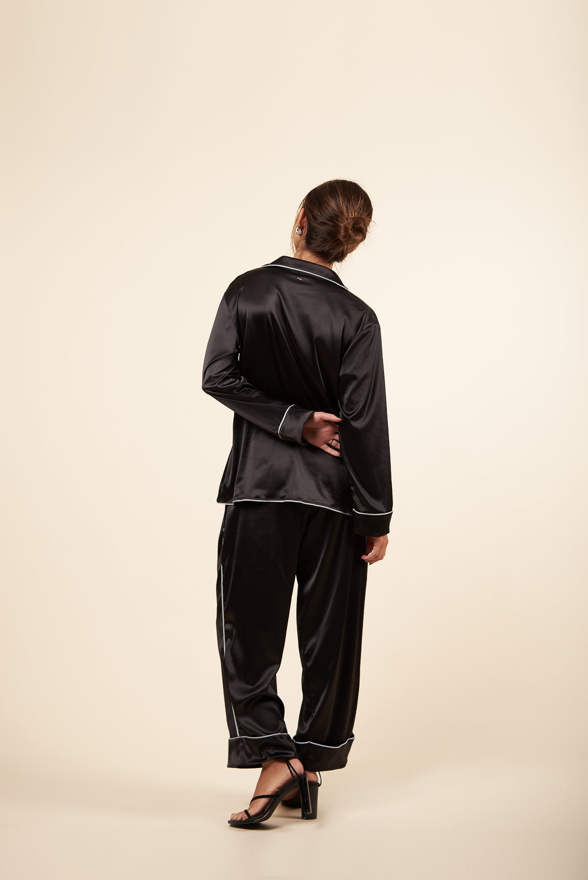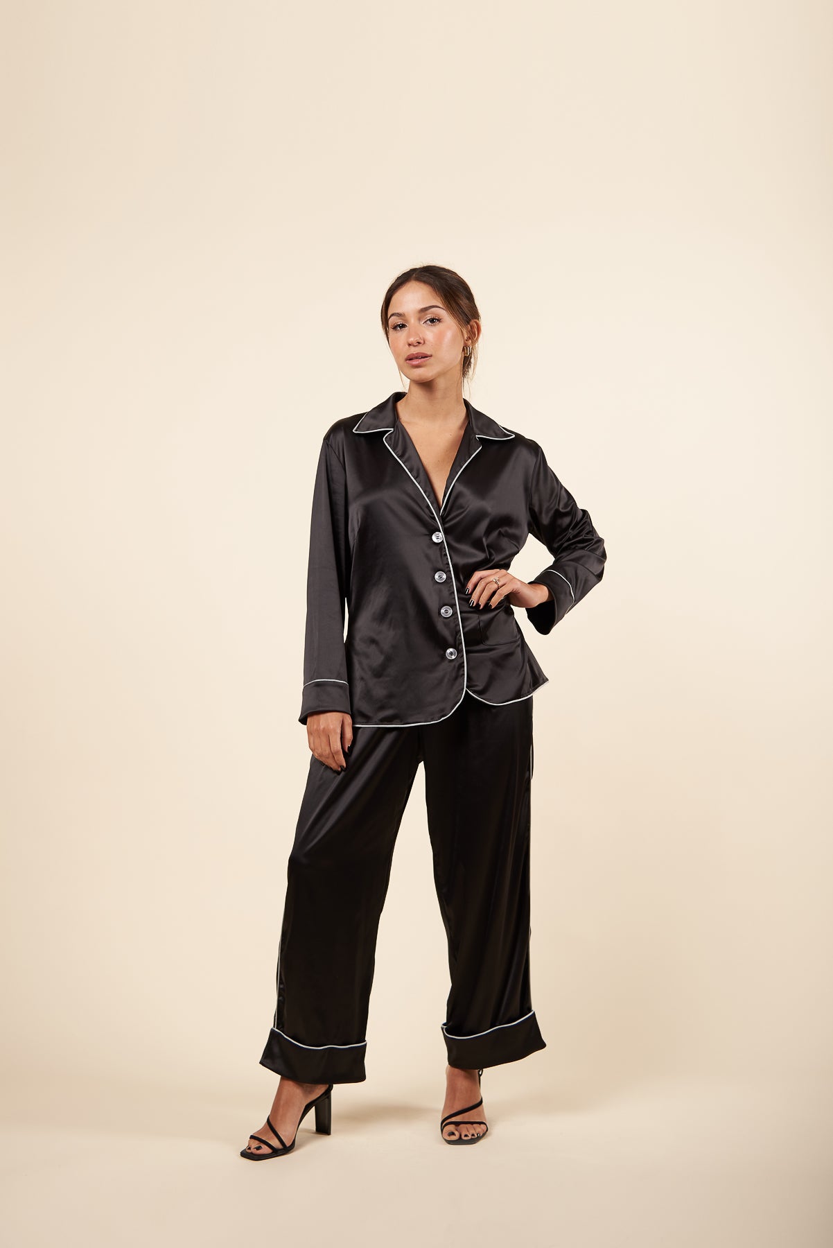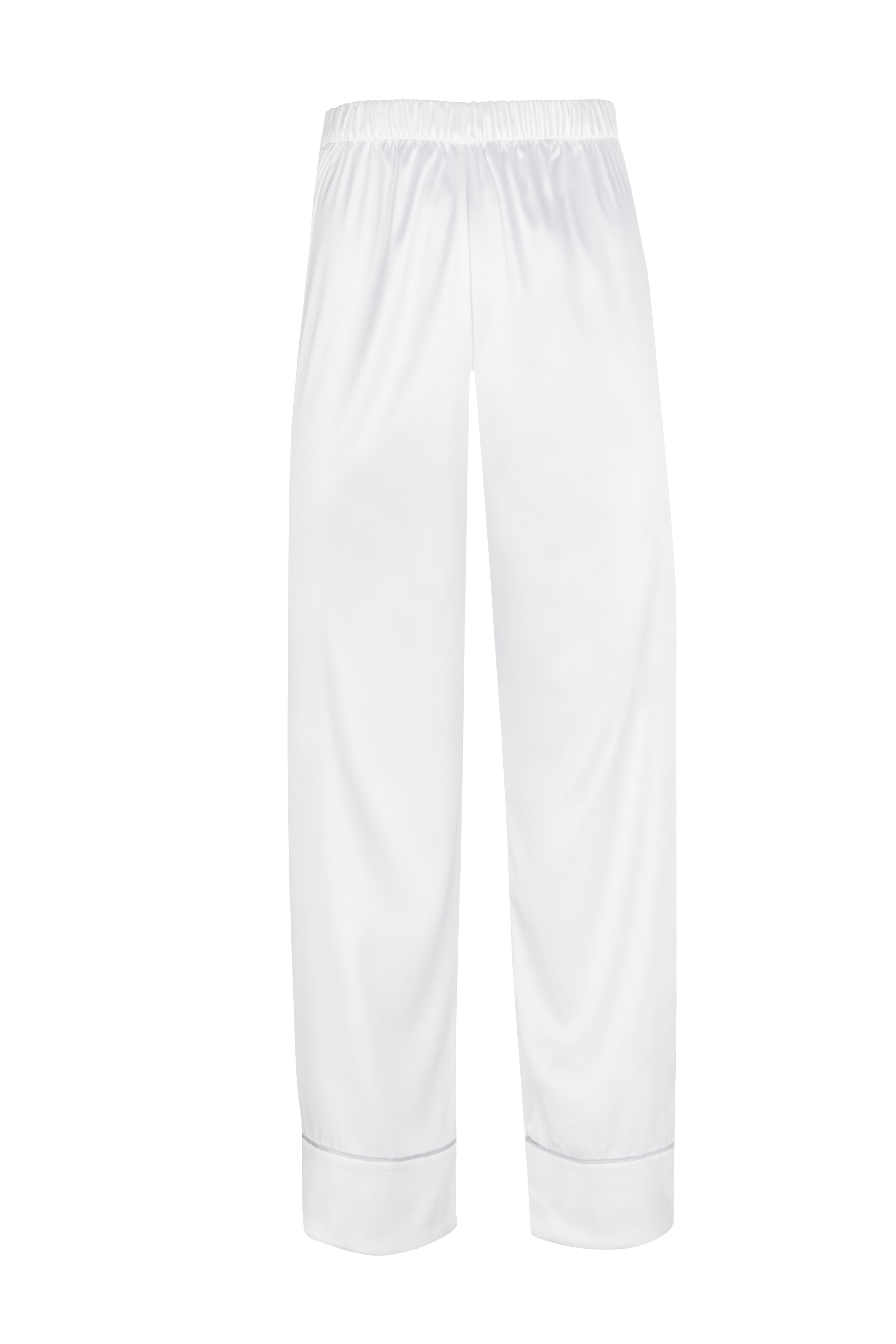 The straight-leg "Chambre Trousers," crafted from stretch satin with a colored bias trim and designed without pockets for a minimalist look, embody both comfort and elegance. The "Chambre Trousers" complete the pajama set when paired with the "Chambre Blouse."