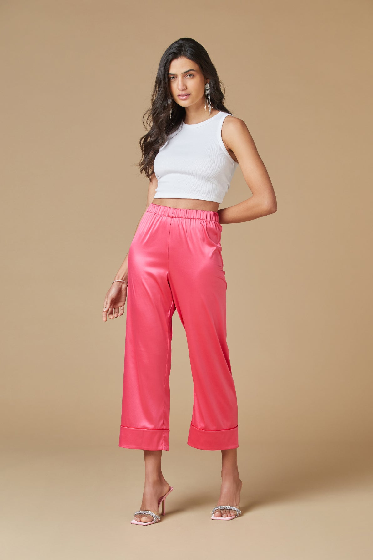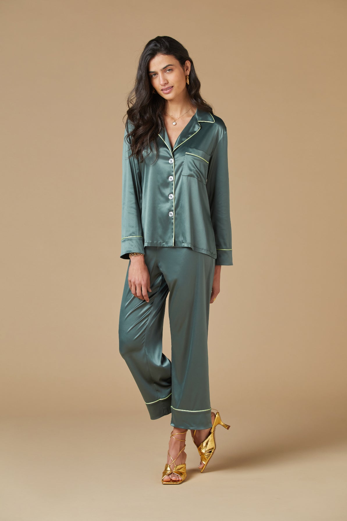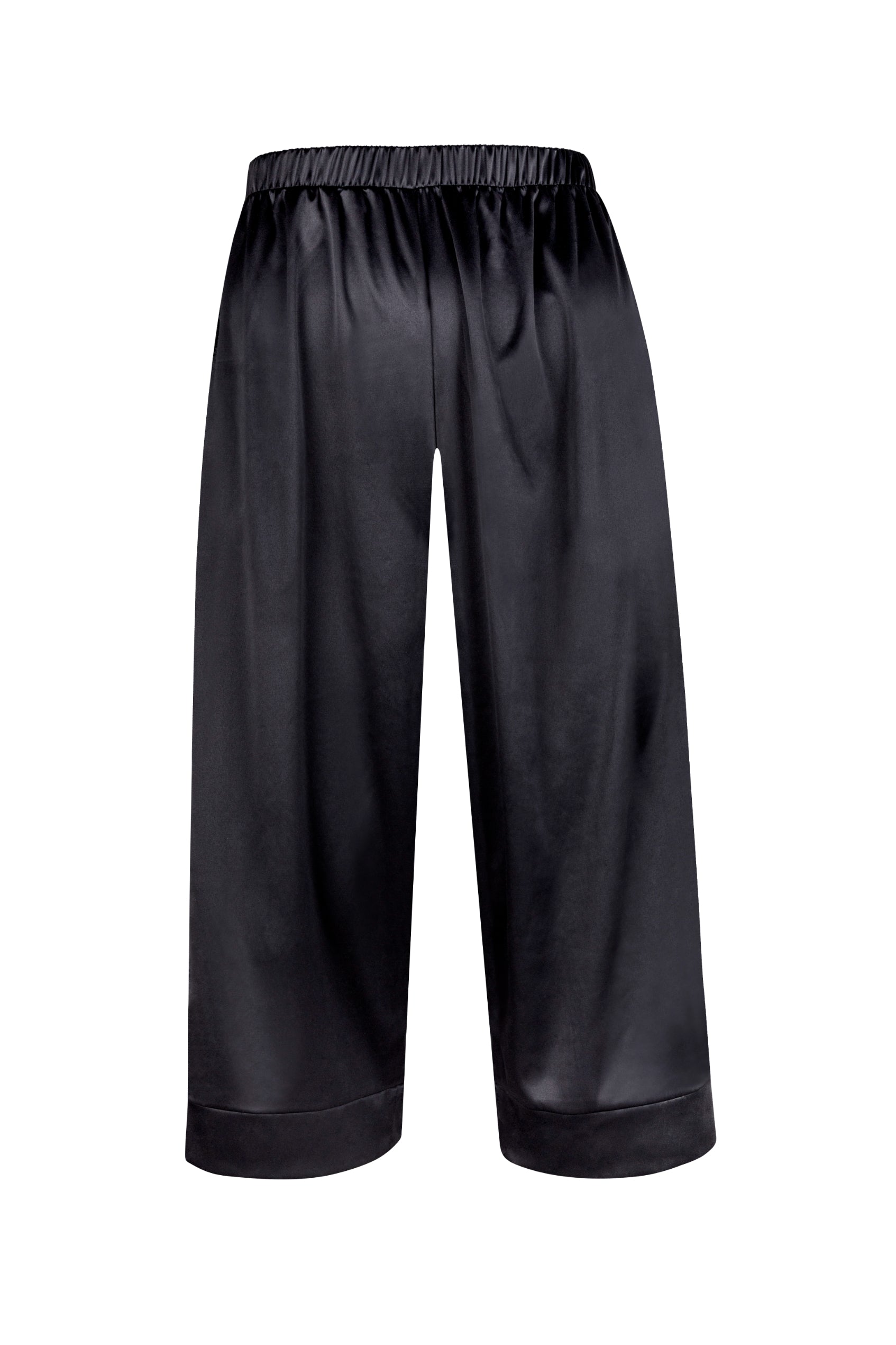 The straight-leg "Chambre Trousers," crafted from stretch satin with a colored bias trim and designed without pockets for a minimalist look, embody both comfort and elegance. The "Chambre Trousers" complete the pajama set when paired with the "Chambre Blouse."