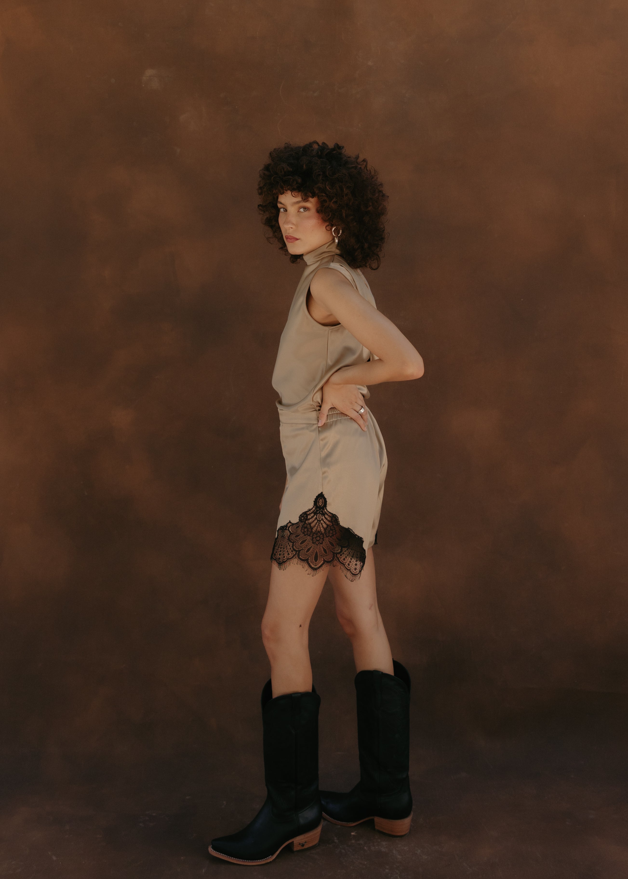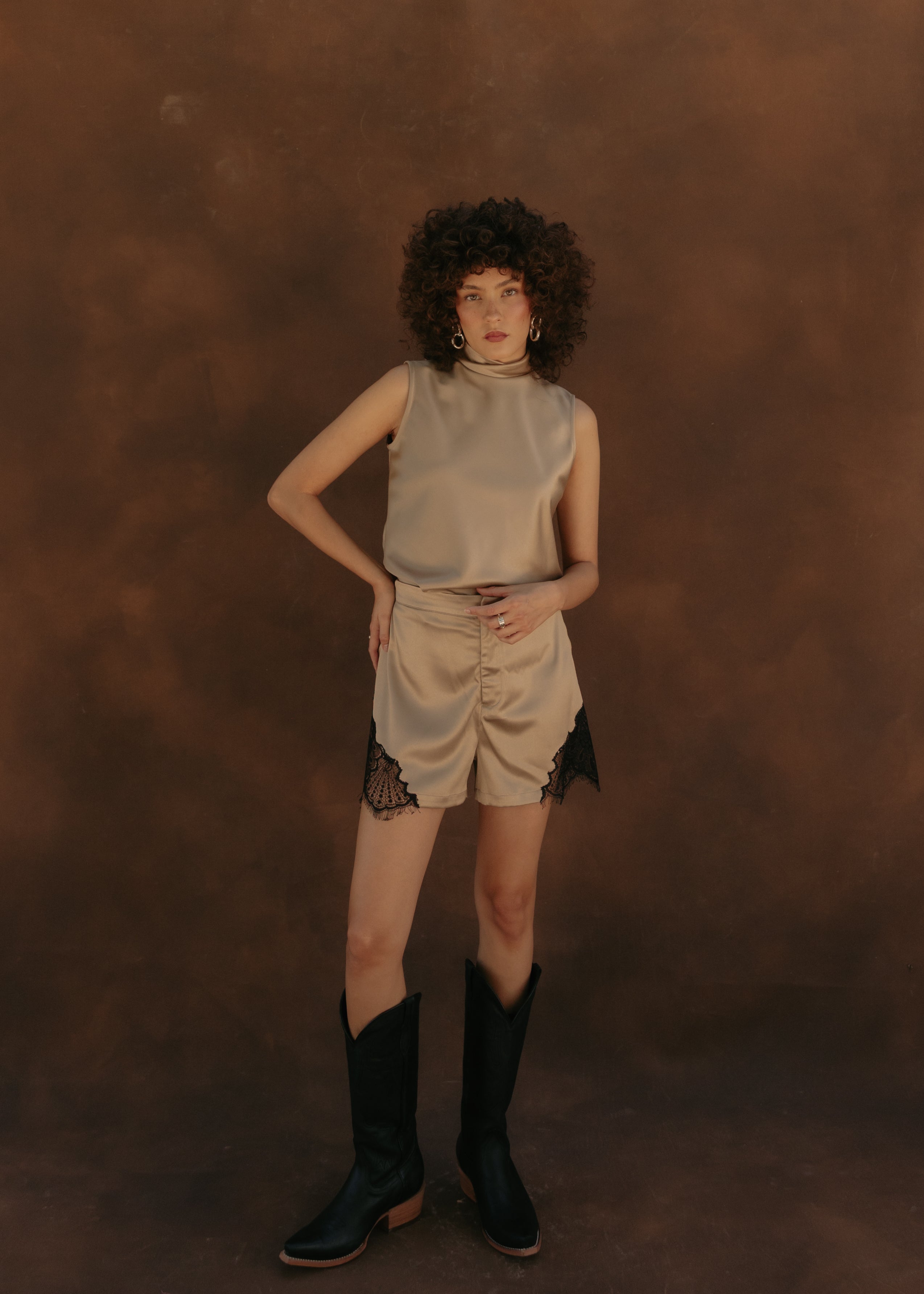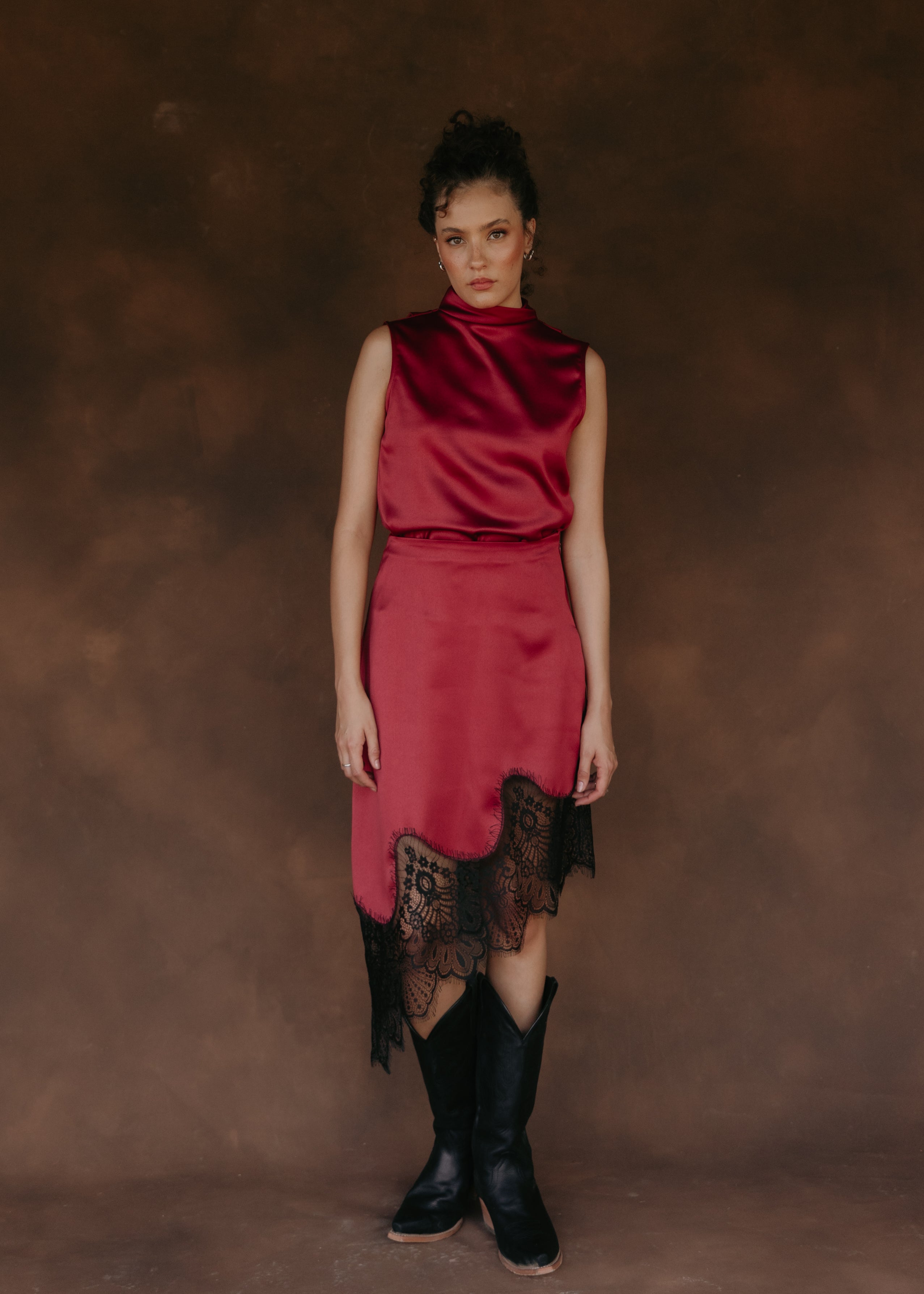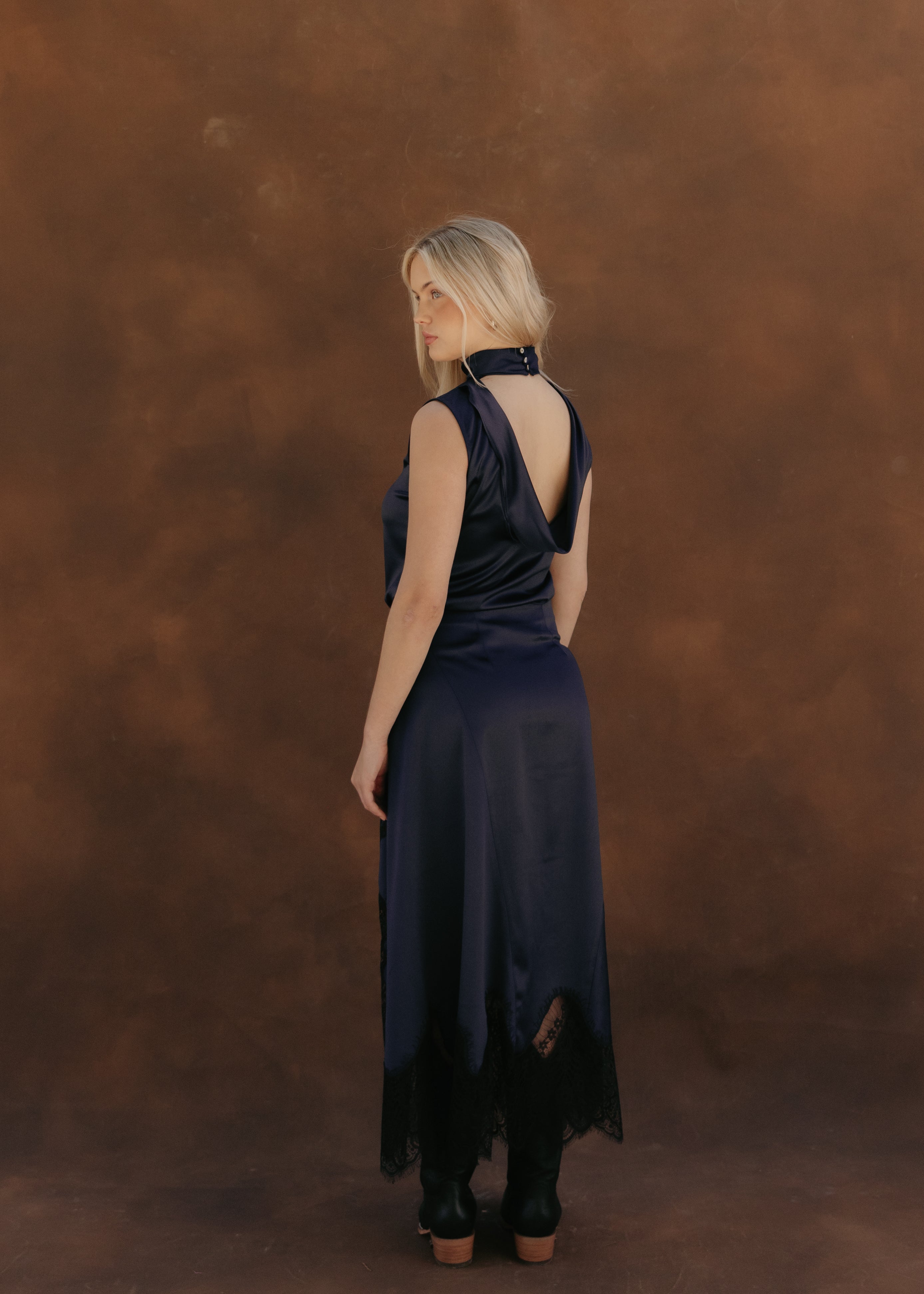 Satin halter top with a swing-back neckline. It features a button-up neckline for a sophisticated and versatile touch. Its subtle sheen and light drape make it perfect for special occasions or elegant evenings.